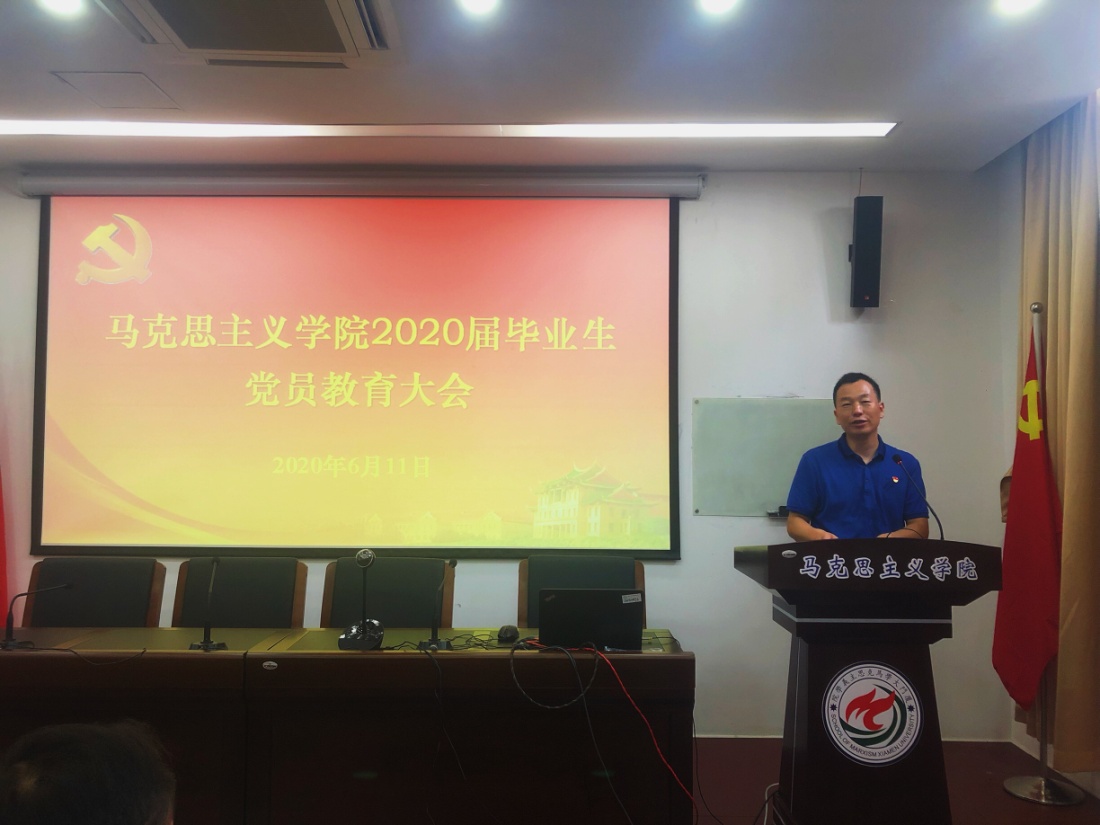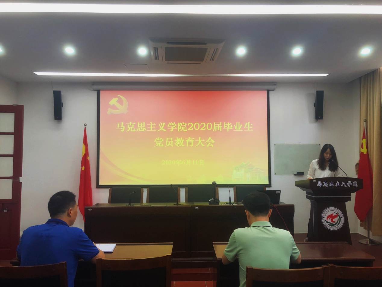 6月11日上午,学院在囊萤楼216会议室召开了2020届毕业生党员教育大会。学院党委副书记杨建中老师,团委书记、辅导员、党支部书记蔡虎堂老师,党务秘书江春萍老师出席了会议。此次会议由党支部副书记林丹主持。