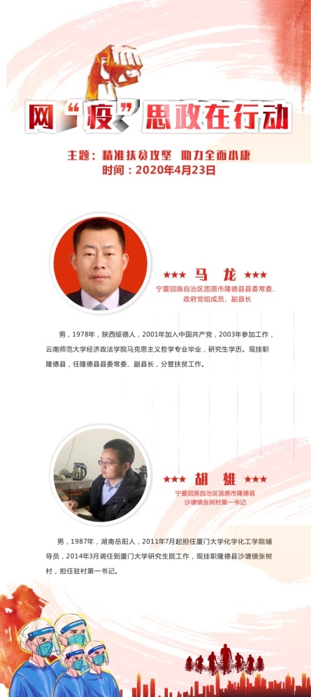 本次课堂以嘉宾连线、师生互动、探讨交流的方式推进专题的讲授和互动。课堂邀请到了目前在宁夏回族自治区固原市隆德县挂职的两位老师,他们是:原医学院副书记、现挂职任隆德县委常委、副县长马龙老师;现挂职担任隆德县沙塘镇张树村第一书记的胡雄老师。嘉宾们用亲身经历与同学们分享和探讨了全国疫情防控背景下他们对于“厦门大学精准扶贫”的思考。