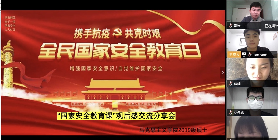 2020年4月15日是我国第5个全民国家安全教育日,今年的活动主题为“坚持总体国家安全观,统筹传统安全和非传统安全,为决胜全面建成小康社会提供坚强保障”。为切实提高学生国家安全意识,提升学生维护国家安全的自觉性和主动性,马克思主义学院团委组织全院学生通过观看“同上一堂国家安全教育公开课——《总体国家安全观视角下的疫情防控》”,同时开展了国家安全教育知识竞赛,主题班会、党(团)日活动等进行“云交流学习”。