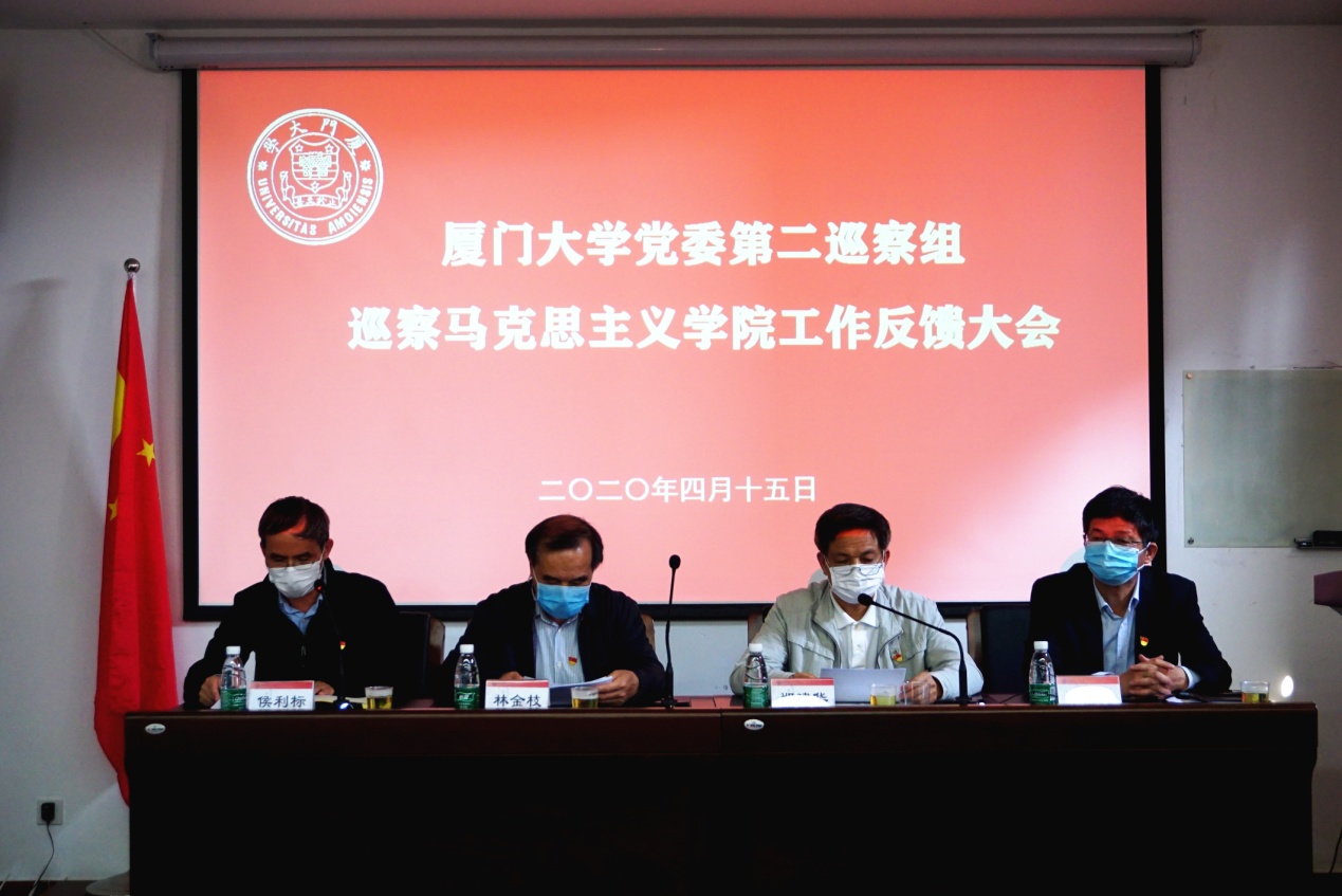 2020年4月15日下午,厦门大学党委第二巡察组巡察马克思主义学院工作反馈会在囊萤楼216报告厅召开。校纪委副书记、纪委办主任、巡察办主任林金枝,校党委第二巡察组组长、资产经营有限公司党委书记郑建华出席会议。校党委常委、宣传部部长、马克思主义学院院长徐进功,院党委书记侯利标,院党政领导班子其他成员、全体在职教职工、退休教师代表等60余人参加了会议。会议由侯利标主持。因受新冠肺炎疫情影响,为减少人员聚集,会议采用网络视频形式进行。