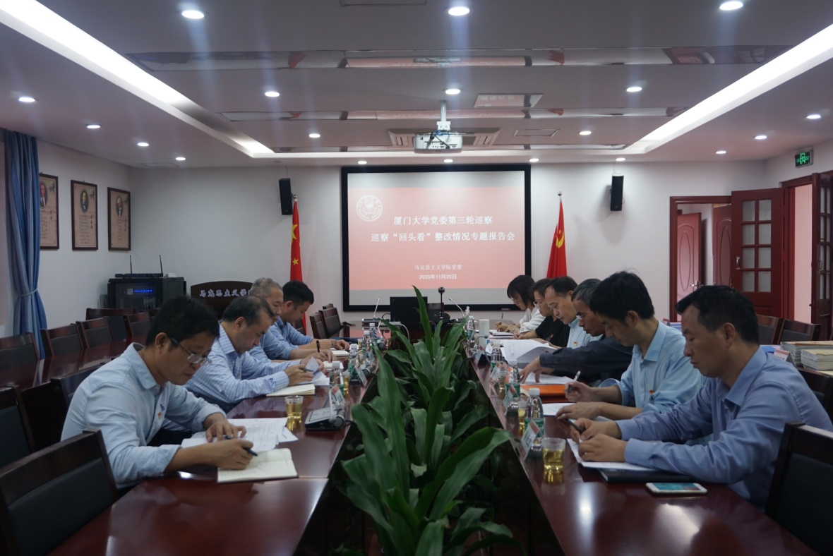 根据校党委第三轮巡察“回头看”工作的统一部署,2020年11月20日下午,“回头看”巡察组在囊萤楼302会议室听取马克思主义学院巡察整改情况专题汇报。“回头看”巡察组组长林金枝,巡察组成员姚有新、洪真裁、袁愉年,我院党政领导班子成员,院办主任、党务秘书、团委书记等参加会议。