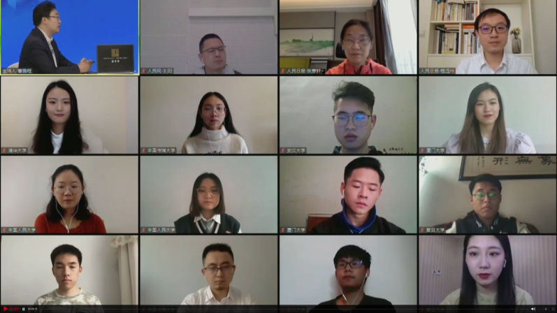 2020年4月21日下午,“人民日报进校园”以《与人民共情——党报人亲历的中国战疫》为题,邀约人民日报湖北前方报道组五位党报人,讲述中国抗疫故事。直播视频同时在线携手清华大学、中国人民大学、中国传媒大学、复旦大学、武汉大学、厦门大学的青年学子,分享交流中国战疫最前线的观察与思考,展示大战大考中的民族精神和时代精神。马克思主义学院组织部分思政课学生收看此次直播视频,有7个班级共计623名同学聆听了此次云中对话。
