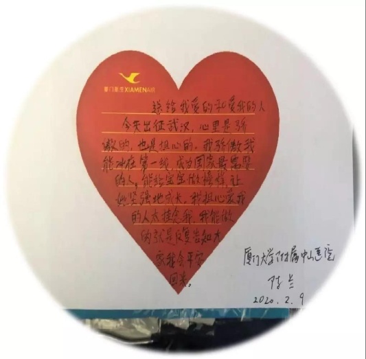 陈兰是厦门大学附属中山医院肾内科副主任,疫情发生后,她第一时间报名支援厦门市定点救治医院。2月8日,接到紧急召令,她主动请缨出征武汉,连夜收拾行李,9日一早随厦门市支援湖北抗击新冠肺炎疫情医疗队二队出征武汉。万千挂念,但义无反顾,一张写在前往武汉航班上的便笺,流露出她当时既骄傲又担心的心情,“我骄傲我能冲在第一线,成为国家最需要的人;我担心爱我的人太挂念我,我能做的就是反复告知大家我会平安回来。”