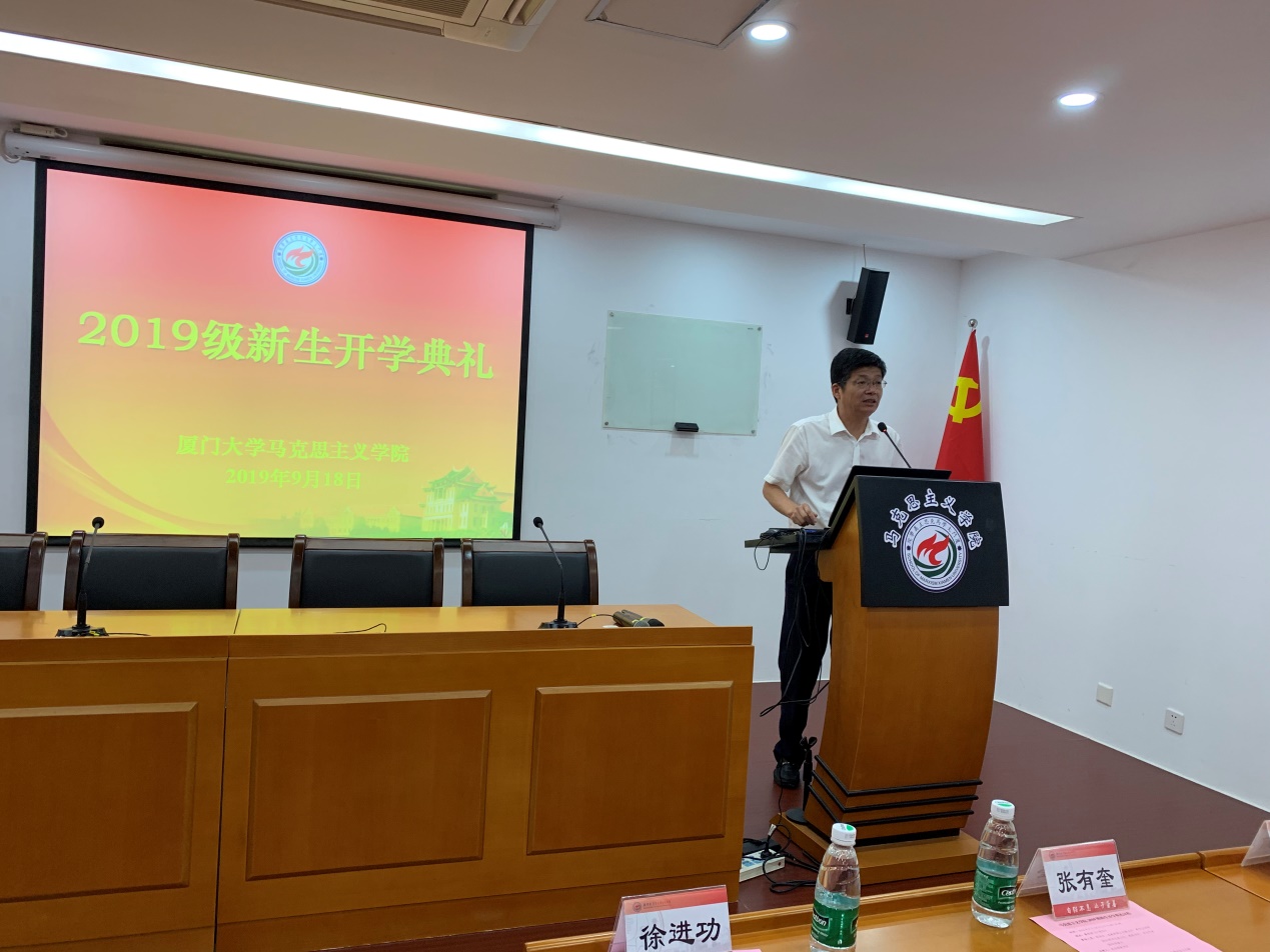 徐进功院长代表学院讲话。他首先从学科建设、人才队伍、思政课教学、科学研究、人才培养、社会服务、党建工作等方面向同学们介绍了马克思主义学院的基本情况,并向2019级全体新生提出四点殷切希望:一是要志存高远,做新时代的追梦人,要树立正确的价值观、世界观、人生观,坚定理想信念;二是要认真钻研原著,做新时代求索者,要潜心读书学习,通读、精读马克思主义著作,注重科研训练,勤于思考;三是要脚踏实地,做新时代实干家,要积极参与各项学术和社会实践活动;四是要树立高尚品格,做新时代崇高者。要坚守自己的初心和底线,切实做到慎独、慎欲、慎微。最后徐院长祝福同学们顺利圆梦。