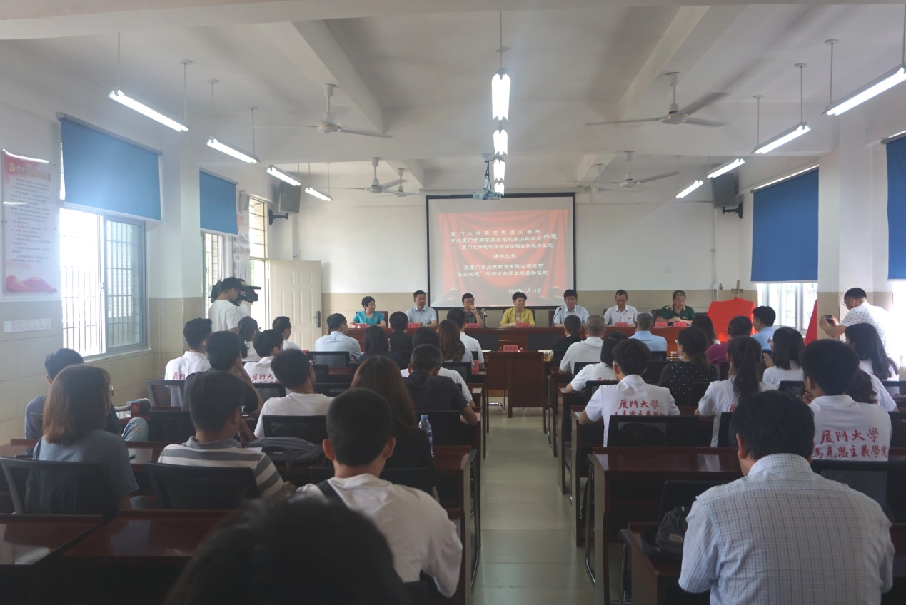 2019年7月14日上午,由厦门大学党委常委、宣传部部长、马克思主义学院院长徐进功和学院党委书记侯利标带队,“追寻总书记足迹,牢记使命,跟党走”实践队一行21人前往厦门市同安区莲花乡军营村(又名高山村)、白交祠村开展实践教学共建活动,会议在军营村高山党校举行。中共厦门市同安区委副书记、区长王雪敏,中共厦门市同安区委常委、组织部部长、区委党校校长王秀珠,中共厦门市委党校常务副校长林朝晖,厦门市旅游集团党委书记、董事长肖平,中共厦门市同安区委党校常务副校长叶文彬,厦门市旅游集团副书记李松以及我院党委副书记原宗丽、办公室主任王筱辉、团委书记蔡虎堂老师出席了本次会议。会议由中共厦门市同安区委党校副校长叶碧星主持。