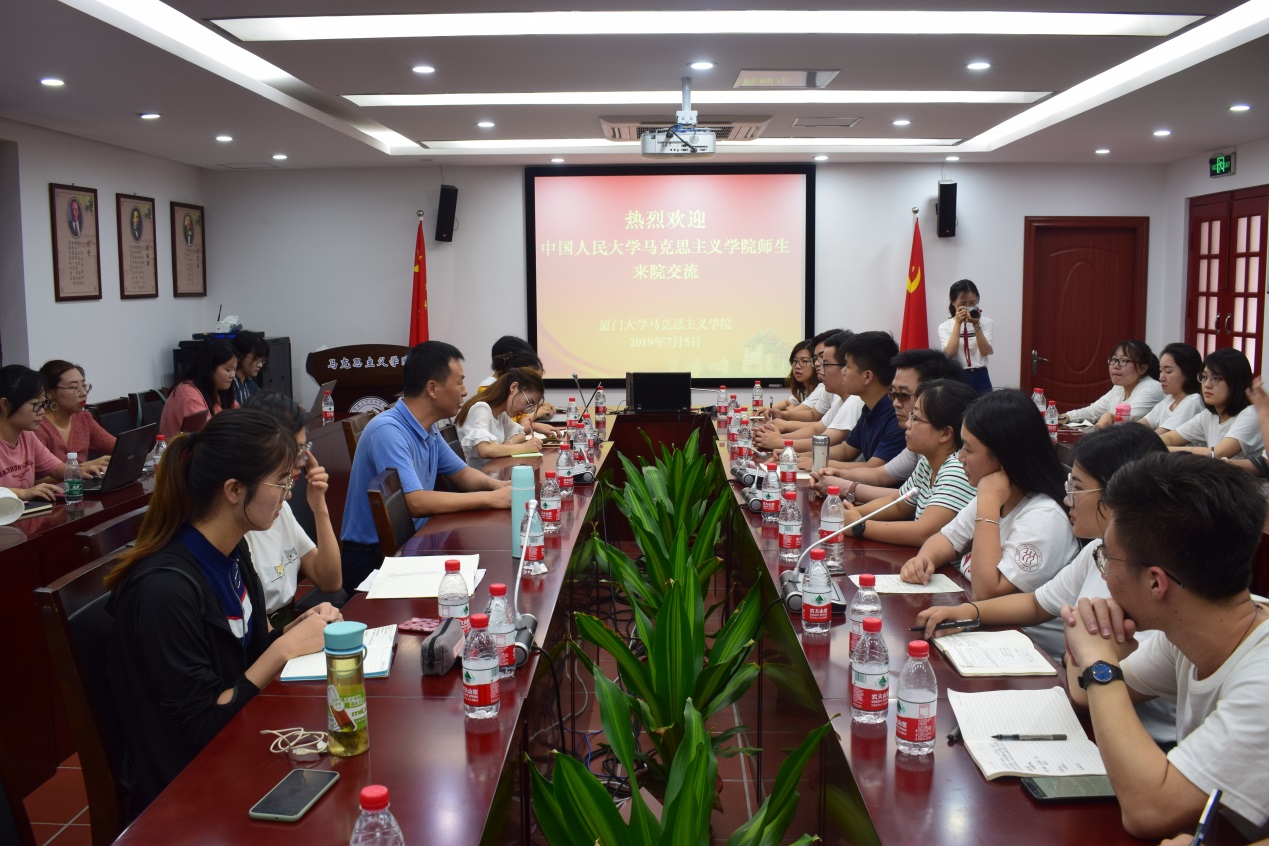 2019年7月5日下午,人大马院团委书记李晓雨老师带领学院师生一行27人来我院交流学习。我院团委书记蔡虎堂老师代表学院接待了李老师一行,并于囊萤楼302室举行了师生交流座谈会。我院2018级硕士生参加了本次座谈会。