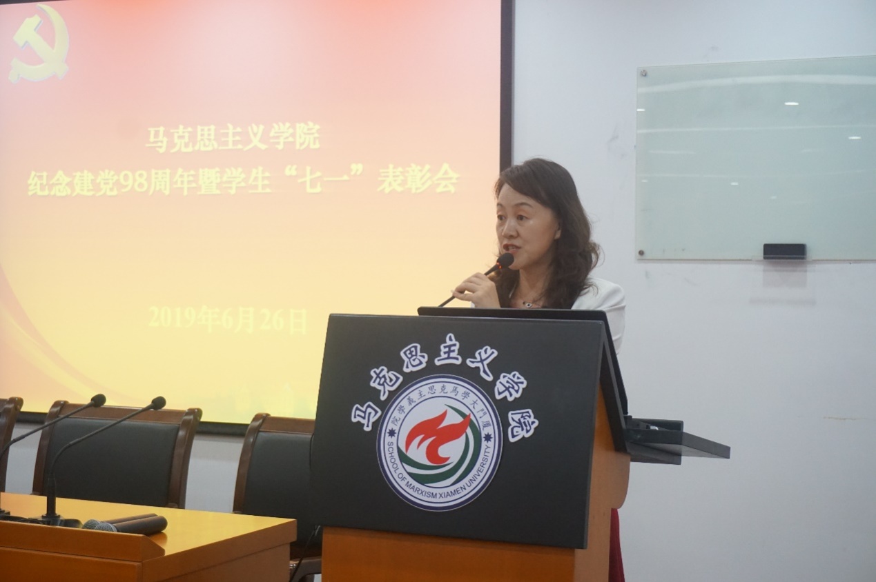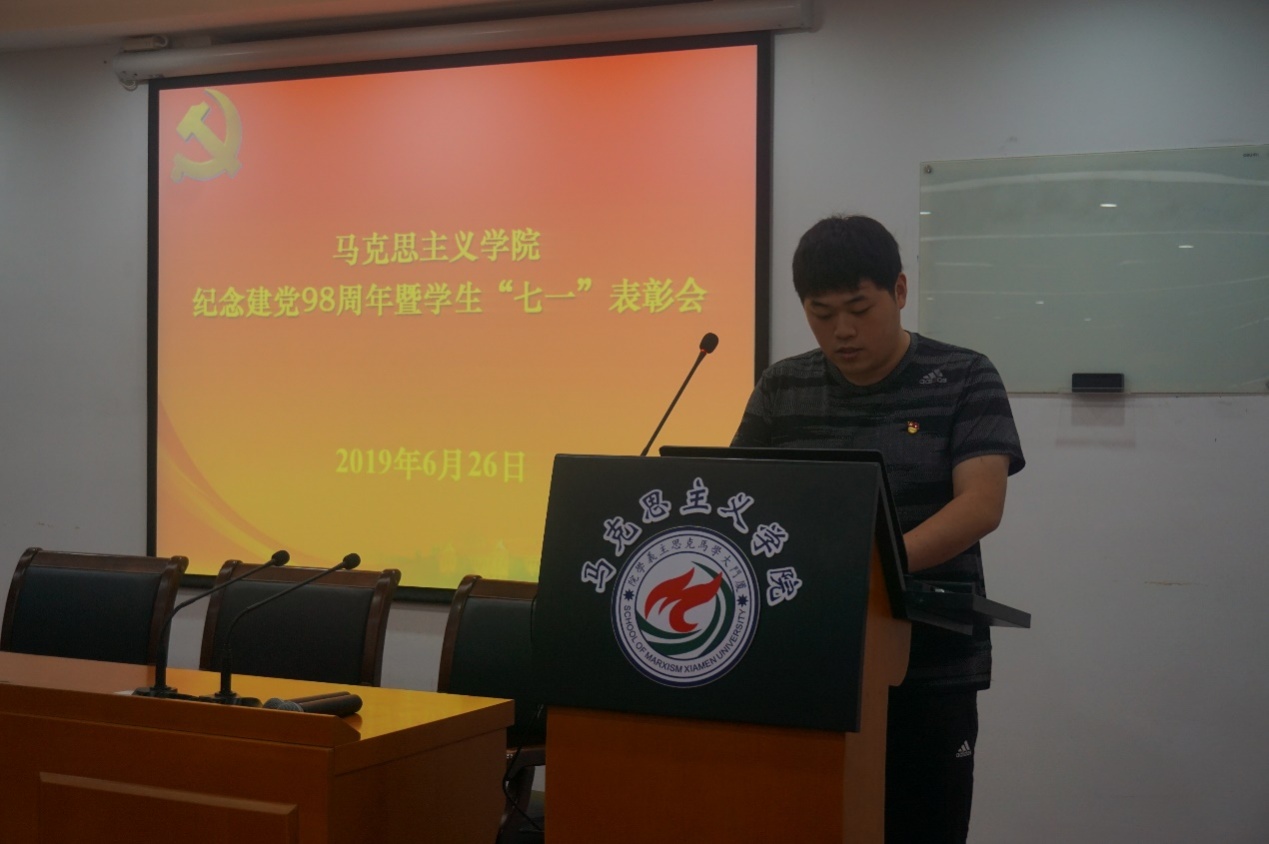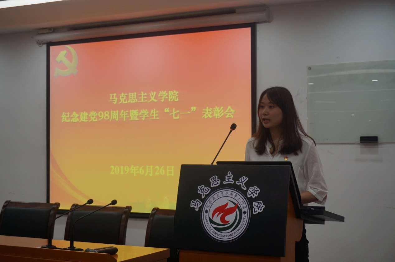 侯利标书记宣读了学院“七一”表彰决定。会议表彰了2018-2019年度优秀党支部书记、优秀共产党员以及革命史馆先进工作者。侯书记向受表彰的同学表示衷心的祝贺,并对他们所做的工作表示充分的肯定和赞扬,同时希望他们时刻秉持厦大校训“自强不息,止于至善”的精神,继续发挥模范带头作用,并勉励在场同学以他们为榜样,积极向他们学习。