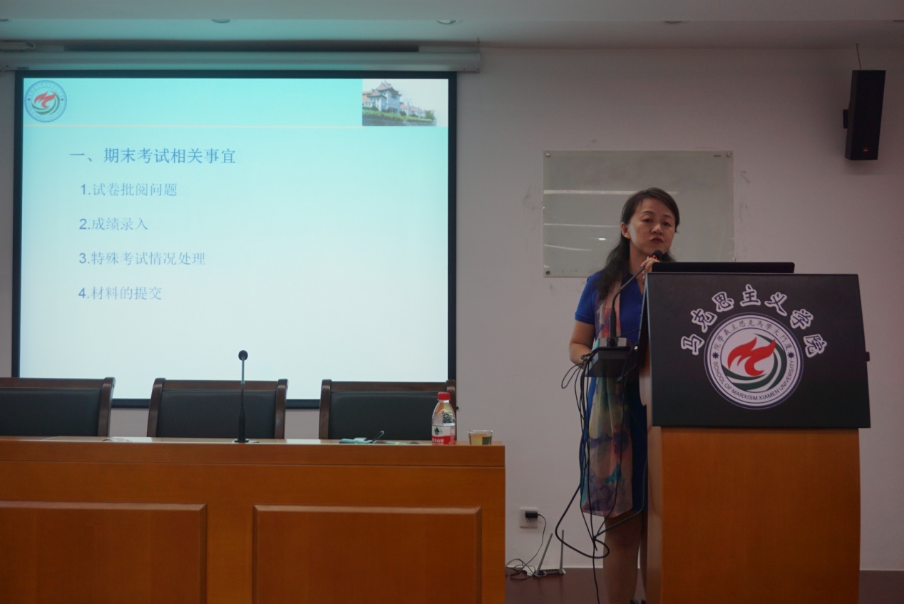 原宗丽副书记就近期学院教学工作安排作简要说明。一是围绕近期的期末考试,就试卷批阅、成绩录入、特殊考试成绩情况处理、期末材料提交等工作作出了详细的要求。二是围绕即将开展的暑期社会实践,着重强调了实践过程中的安全问题及实践成效等方面。三是围绕下学期开课的相关事宜作通报说明。
