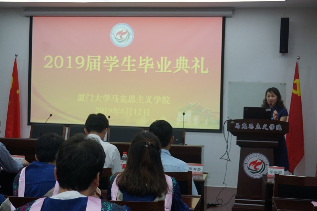 徐进功院长代表学院致辞。他向圆满完成学业、即将开启人生新征程的2019届毕业生,致以最热烈的祝贺!向辛勤付出的各位老师、各位家长,致以最衷心的感谢!徐进功院长首先介绍了毕业生的毕业情况,并对每一位同学在这三年中得到的锻炼,收获的成长,对自己的未来做出的无愧于青春和时代的选择表示十分的欣慰,也倍感自豪。随后,徐进功院长结合习近平总书记关于青年成长成才的系列讲话,向即将开启自己新的人生阶段的同学们提出以下几点希望:第一,要重基本;第二,要勤实践;第三,要勇担当。最后,徐进功院长表示,厦大马院永远是同学们坚强的后盾和温暖的港湾,衷心祝愿所有毕业生一路顺风、前程似锦、平安幸福。