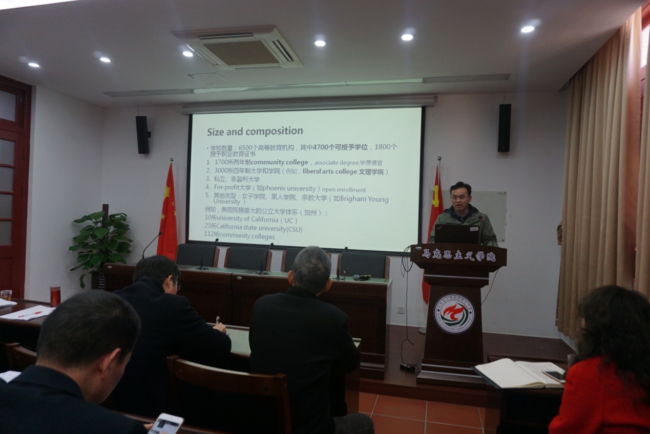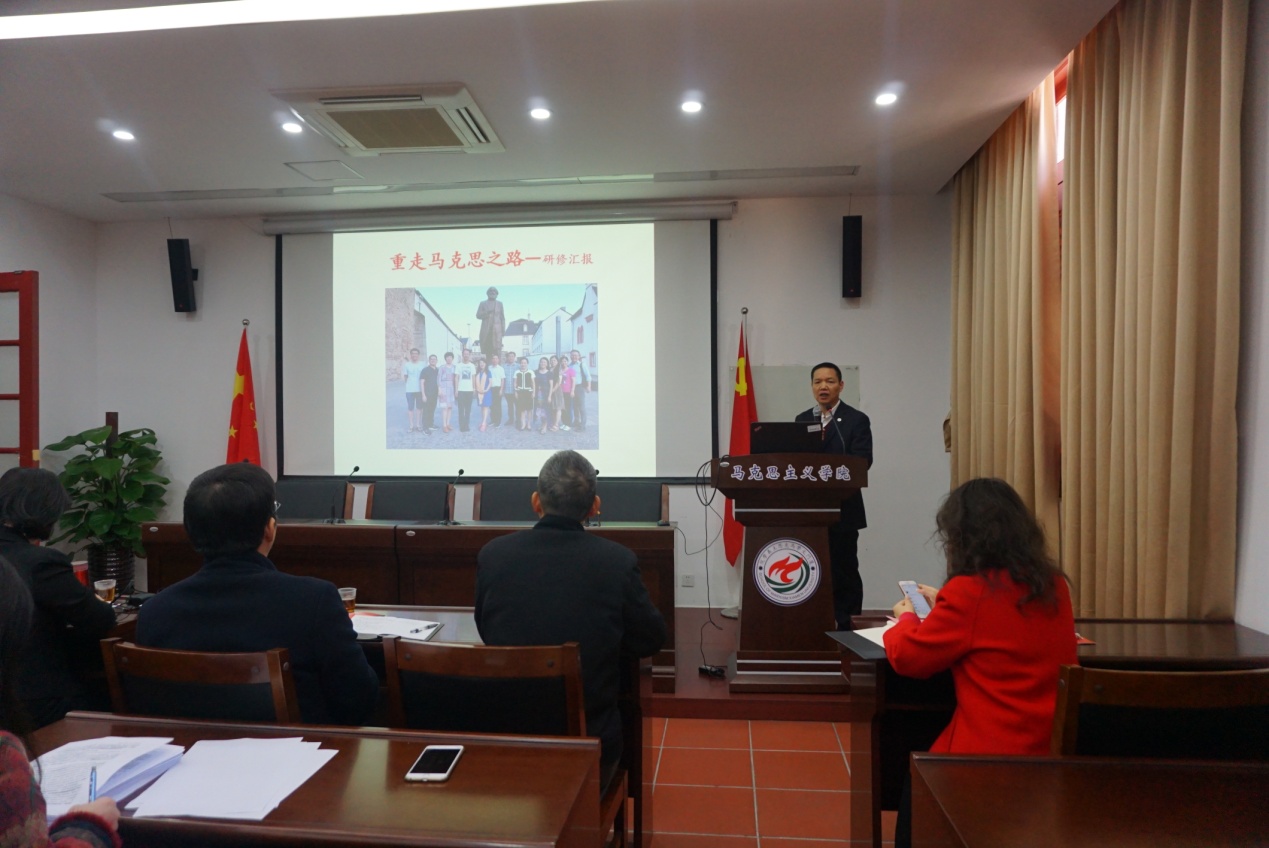 首先进行的是教师2018年出国访学研修成果汇报。罗礼太老师汇报了思政课教师“重走马克思之路”国外研修的成果,蒋昭阳老师则结合自身研修经历分享了对于美国高等教育的一些思考。