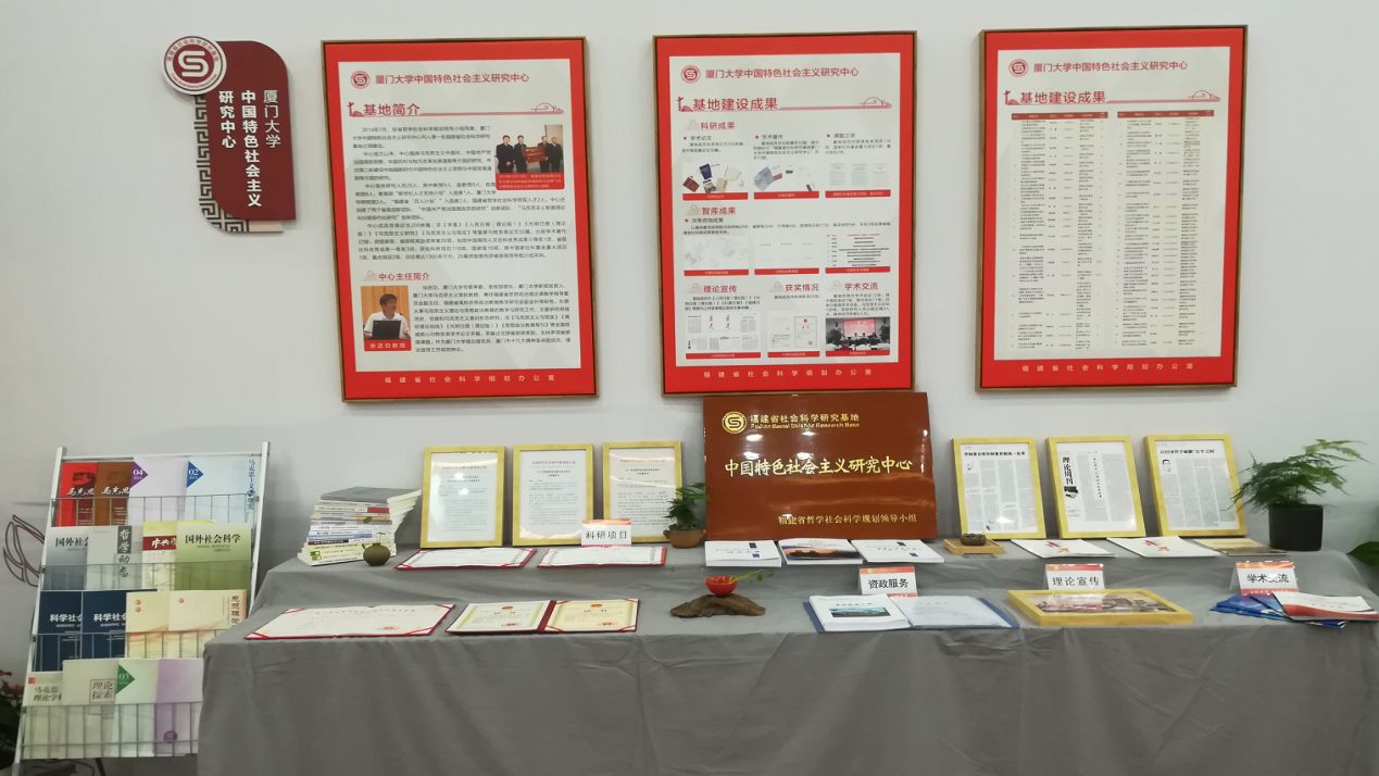 厦门大学中国特色社会主义研究中心通过图文并茂的宣传展板,内容详实的基地画册,集中展现了我基地科学研究、理论宣传、学术交流、资政服务等丰硕成果,展示了我基地的特色与亮点。