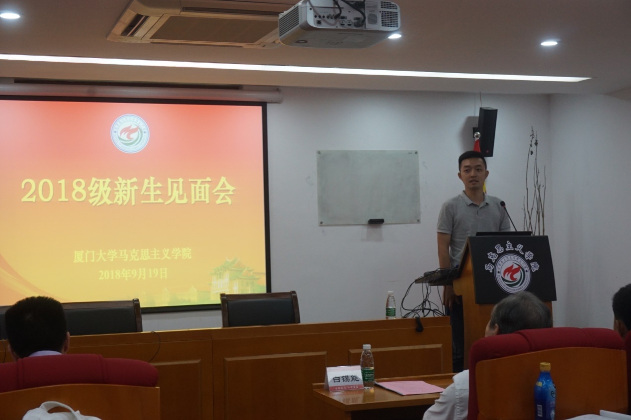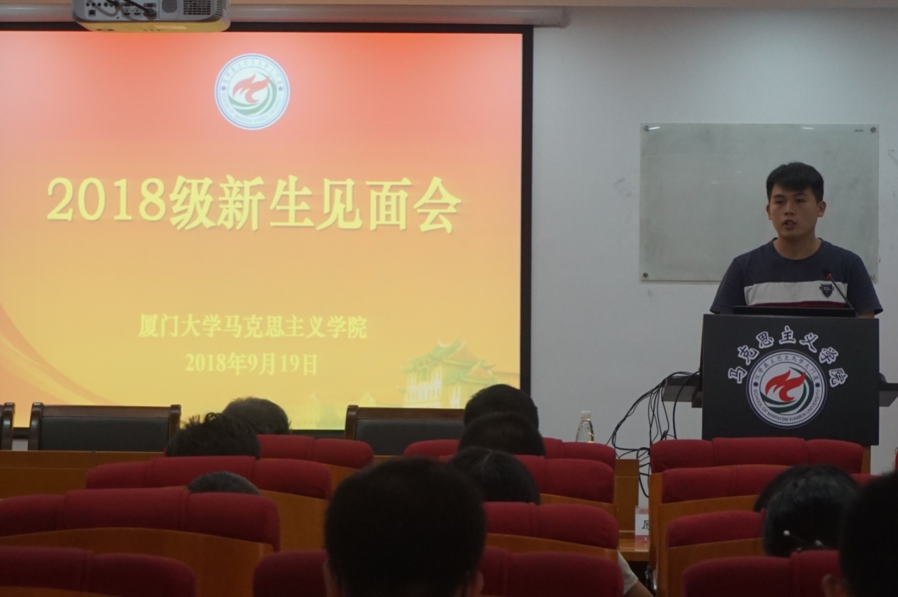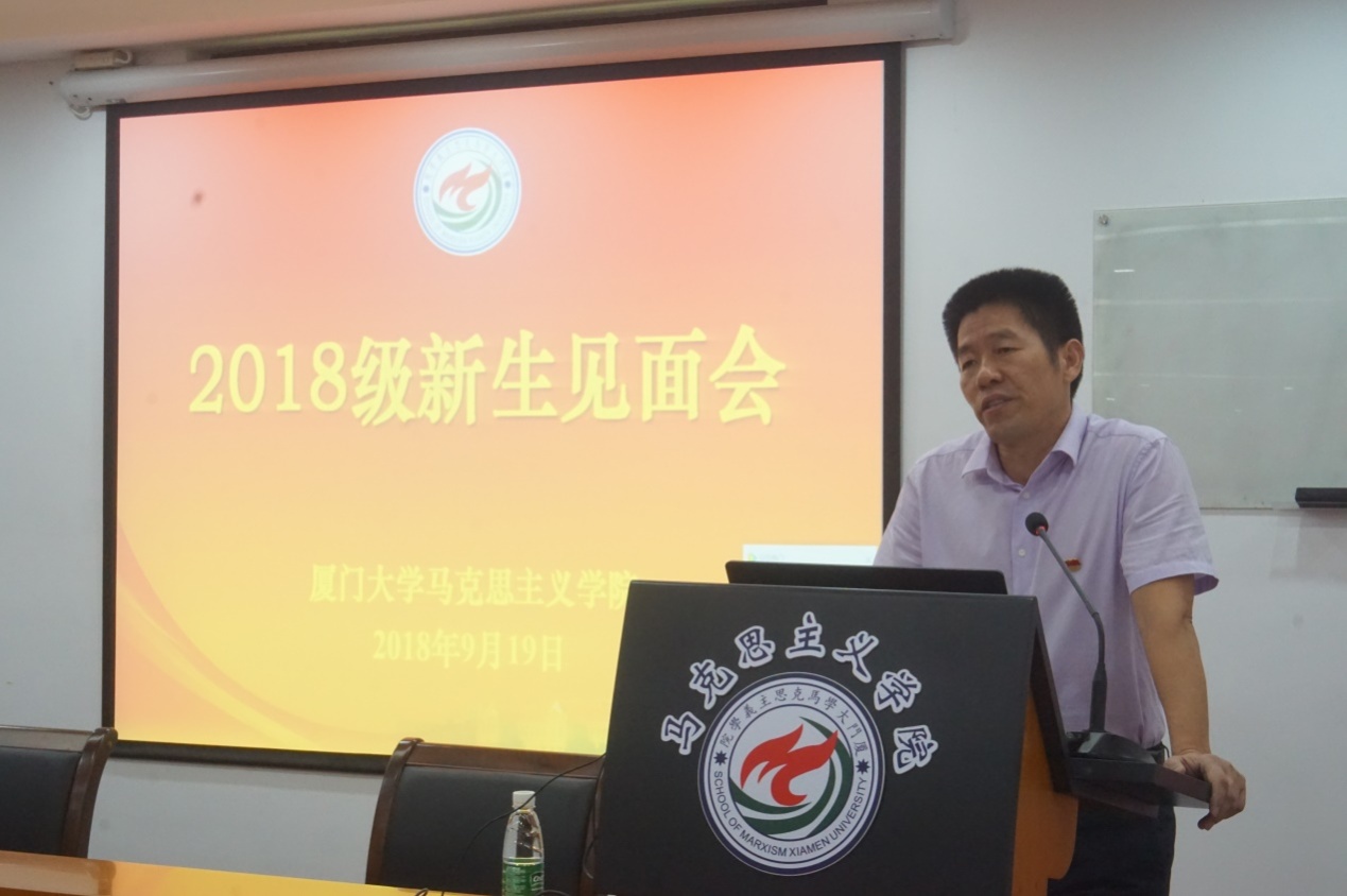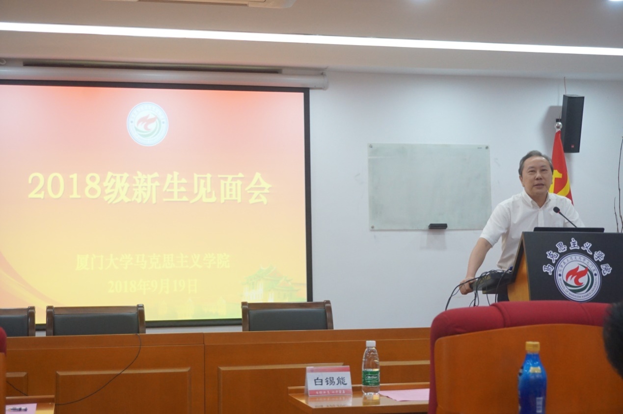 奏唱国歌结束后,学院白锡能院长对厦门大学和马克思主义学院的基本情况进行了介绍,并结合习近平总书记在北大考察时对广大青年提出的要求,向2018级全体新生提出了四点希望,要求他们要坚定理想信念,坚定“四个自信”,增强“四个意识”,要真学、真信、真懂、真用马克思主义;要潜心读书学习,通读、精读马克思主义著作;要注重科研训练,勤于思考;积极参加社会实践。白院长的讲话让全体新生受益匪浅。