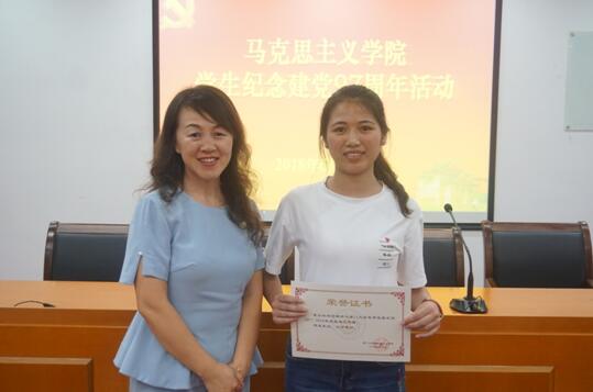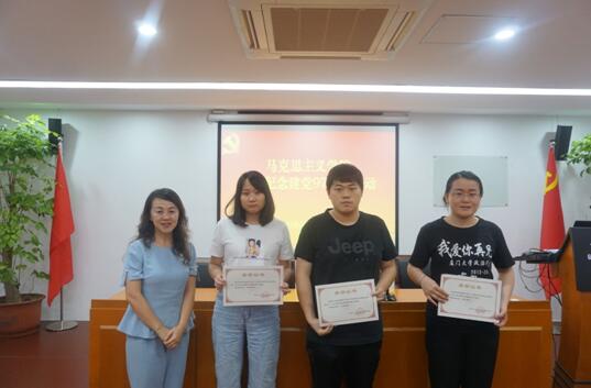 面对鲜红的党旗,由2016级研究生党支部书记葛开勇领誓,张顺凤、宋江雪、周琪、唐瑞芝、赵华美等五位预备党员用铿锵有力的声音进行了入党宣誓。宣誓完毕,在庄严的国际歌中五位预备党员佩戴上了党徽。随后进行的是学院2018年“七一”表彰,蔡虎堂老师宣读了本次表彰名单,原宗丽副书记为受表彰的3位优秀共产党员以及4位革命史馆先进个人颁发奖状。蔡虎堂老师对五位预备党员表达了继续发挥先锋模范作用的殷切希望,同时也号召在座同学向受表彰的同学学习。