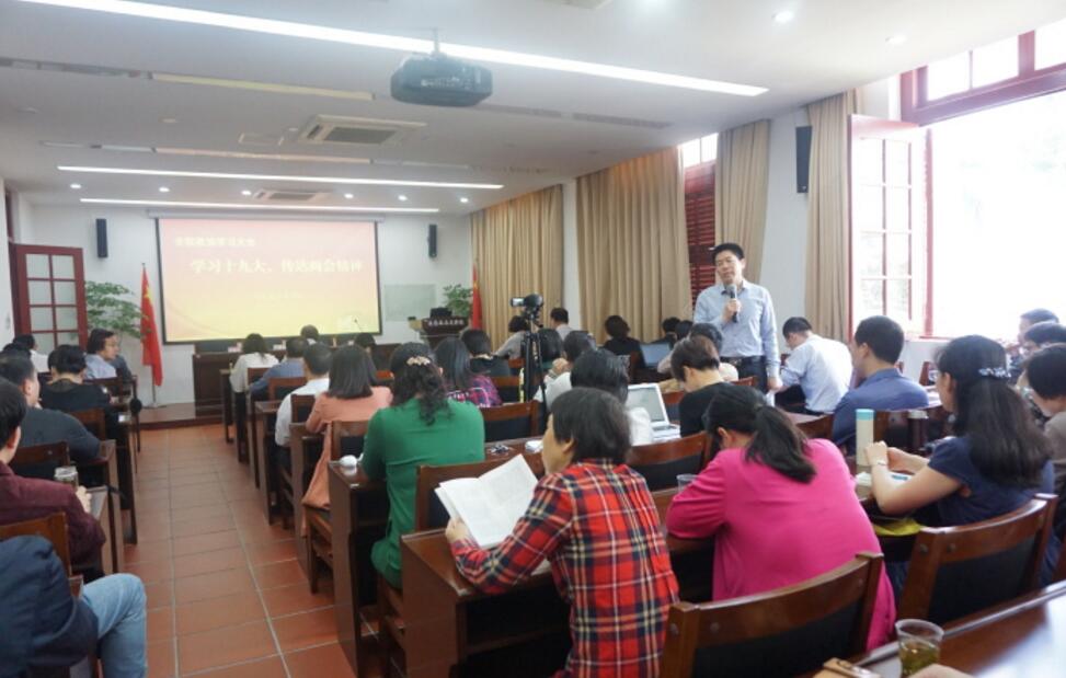 这样的互动在会上出现了多次。全体思政课教师定期参加集中政治理论学习,是马克思主义学院党委的一贯做法。这次学习会上新增了互动分享环节,激发和调动了台下老师们的兴趣和思考,抬头率明显提高。更让人耳目一新的是,此次学习会邀请了三位“嘉宾”作主题发言,他们分别是贺东航教授、罗文副教授,以及肖斌副教授。三位专家各自结合自身专业研究所长,为在场的师生奉献了满满的“干货”。