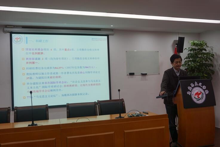 张有奎副院长就科研、人事和社会服务工作进行汇报。他指出,2017年,学院在科研工作方面取得了重要成就,多项指标在全校文科单位中名列前茅,并成功举办了建院以来首次国际学术会议;在师资建设方面,学院教师队伍规模和层次有了新的提升,并首次启动思政课教师海外考察研修活动且圆满完成第一次任务;社会服务工作方面也成绩显著。针对2018的工作,他提出应围绕第四轮学科评估的指标体系和马克思主义理论博士一级学科申报要求的工作进一步具体展开,并对如何实现科研核心目标和队伍核心目标提出具体可行的意见。