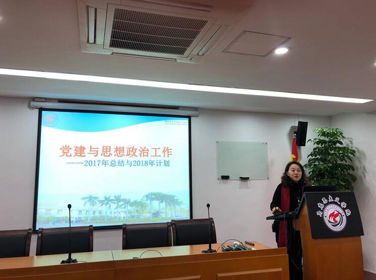原宗丽副书记就党建与思想政治工作进行汇报。她从深入学习贯彻党的十九大精神与习近平新时代中国特色社会主义思想等十一个方面对学院2017年的党建与思想政治工作进行总结,并从九个方面对2018年的工作思路进行汇报。汇报中,她特别强调了四项工作:一是把党的政治建设摆在首位,扎实开展“不忘初心、牢记使命”主题教育,做好2018年“党建质量年”各项工作安排部署;二是积极配合筹备召开学校第十一次党代会;三是加强师德师风建设,营造责任担当、积极向上的良好氛围;四是以“一流党建保证双一流”建设顺利推进。汇报最后,她再次强调要加强日常课堂管理、学风建设,积极引导学生的学习、思想,同时也要关注学生的心理健康。