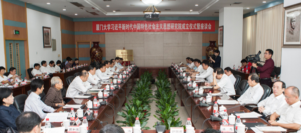 为深入学习贯彻党的十九大精神,大力推进习近平新时代中国特色社会主义思想研究,充分发挥多学科、综合性和研究型大学优势,传承学校马克思主义研究传播的优良传统,11月3日上午,学校举行厦门大学习近平新时代中国特色社会主义思想研究院成立仪式暨专家座谈会,数十名省市专家学者齐聚一堂,共同就如何办好习近平新时代中国特色社会主义思想研究院,如何进一步深入学习贯彻落实党的十九大精神等进行探讨和交流。成立仪式上,校党委书记张彦、校长张荣共同为研究院揭牌。校党委副书记、副校长李建发主持仪式,张荣主持座谈会。