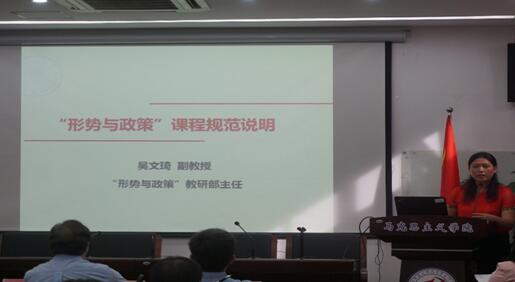 接着,马克思主义学院形势与政策教研部主任吴文琦老师和学生工作部刘群鑫老师分别对课程规范和信息平台操作进行说明。吴老师从课程设置、马克思主义学院职责、课程管理等方面做了完整细致的介绍,让与会者对形势与政策课程的基本情况和具体要求有了全面了解,为今后该课程教学活动的顺利开展奠定了良好的基础。