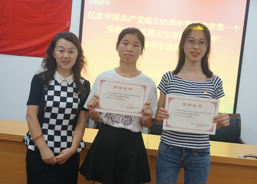 原宗丽副书记宣读有关表彰的决定,并为“优秀共产党员”的获奖同学进行颁奖。欧阳佑民常务副主任为获得厦门大学革命史展览馆2016年度先进工作者同学颁奖。许和山书记为厦门大学马克思主义学院革命史展览馆研究生讲解员团队优秀团队颁奖。
