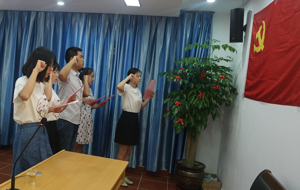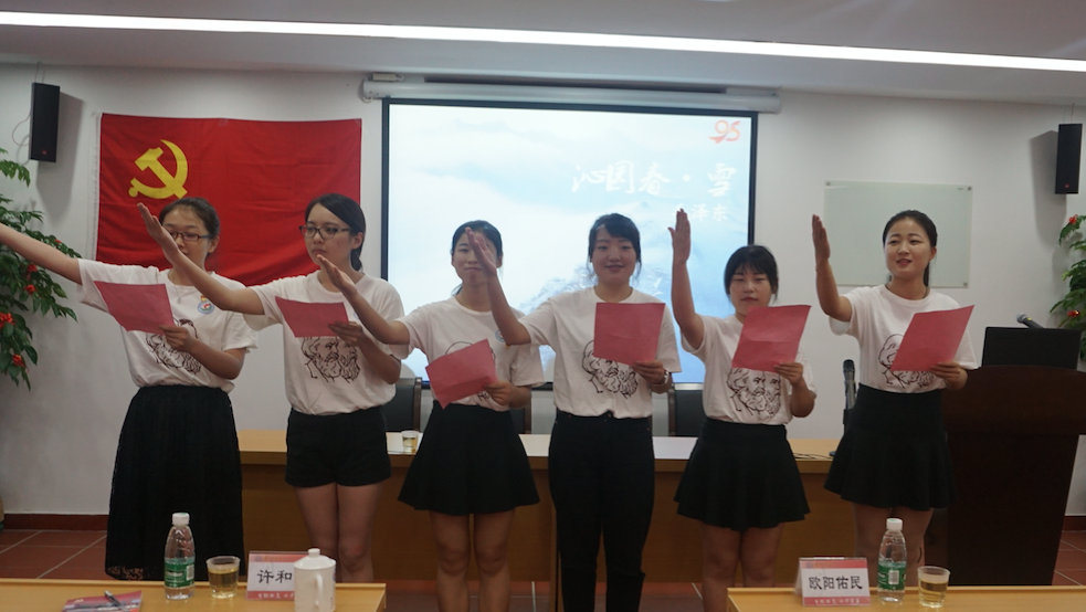 在奏唱国歌之后,进入新党员宣誓环节。我院2014级研究生胡新蕾、杨海阔同学以及2015级研究生王璐、邓登瑶同学,在2014级党支部书记蔡丽娟同志领宣下,面对党旗庄严宣誓,并在誓词上郑重签下了名字。