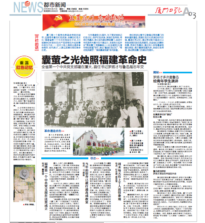 1926 年2 月,罗扬才、罗秋天、李觉民三位厦大学子,热血激扬,在这建起福建省第一个中共党支部——厦大党支部,罗扬才任书记。目前已有的史料,暂无从考证是2 月的哪天,是白天,还是夜晚。但在那乍暖还寒的初春,一道囊萤之光从这里烛照福建革命史。