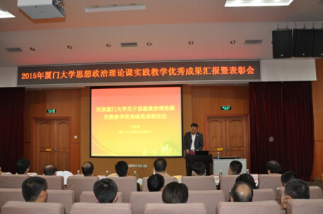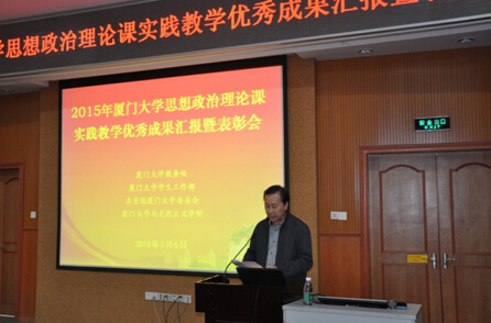 我校思想政治理论课实践教学中心主任朱冬亮教授对2015年厦门大学思想政治理论课实践教学工作进行总结汇报。他主要从思想政治理论课实践教学的意义、相关指示、过程展示、成果总结以及工作展望五个方面进行了汇报,内容丰富,图文并茂,数据详实。