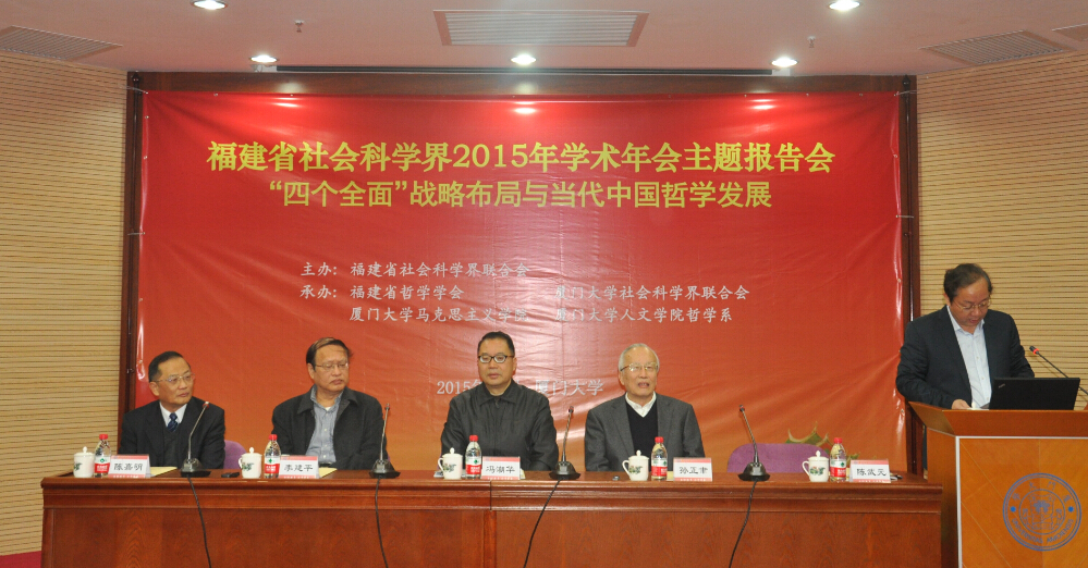 2015年12月20日,福建省社会科学界2015年学术年会主题报告会“‘四个全面’战略布局与当代中国哲学发展”在厦门大学召开。本次学术年会主题报告会由福建省社会科学界联合会主办,福建省哲学学会、厦门大学社会科学界联合会、厦门大学马克思主义学院和厦门大学人文学院哲学系共同承办。报告会邀请到的三位主讲嘉宾是吉林大学孙正聿教授、福建师范大学李建平教授和厦门大学陈嘉明教授。福建省社科联党组书记、副主席冯潮华致辞,厦门大学社科处处长陈武元教授主持报告会。