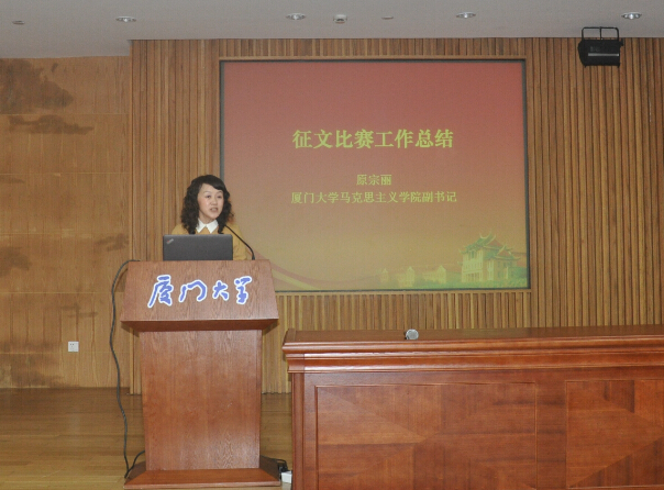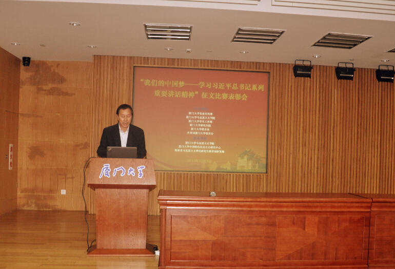 2015年12月9日下午,在纪念“一二·九”学生爱国运动80周年这个非常有意义的日子里,由厦门大学党委宣传部、马克思主义学院、学生工作部、研究生院、教务处以及共青团厦门大学委员会联合举办的“我们的中国梦——学习习近平总书记系列重要讲话精神”征文比赛表彰会在科学艺术中心多功能厅隆重召开,这也标志历时半年之久的理论征文比赛活动圆满结束。校党委副书记林东伟、党委宣传部部长徐进功、马克思主义学院院长白锡能、校团委书记陈怀锋、研究生院培养与管理办公室副主任薛成龙、马克思主义学院党委副书记原宗丽、评委教师代表张艳涛教授以及各学院党委副书记、全体获奖学生、马克思主义学院全体研究生参加了此次会议。会议由白锡能院长主持。