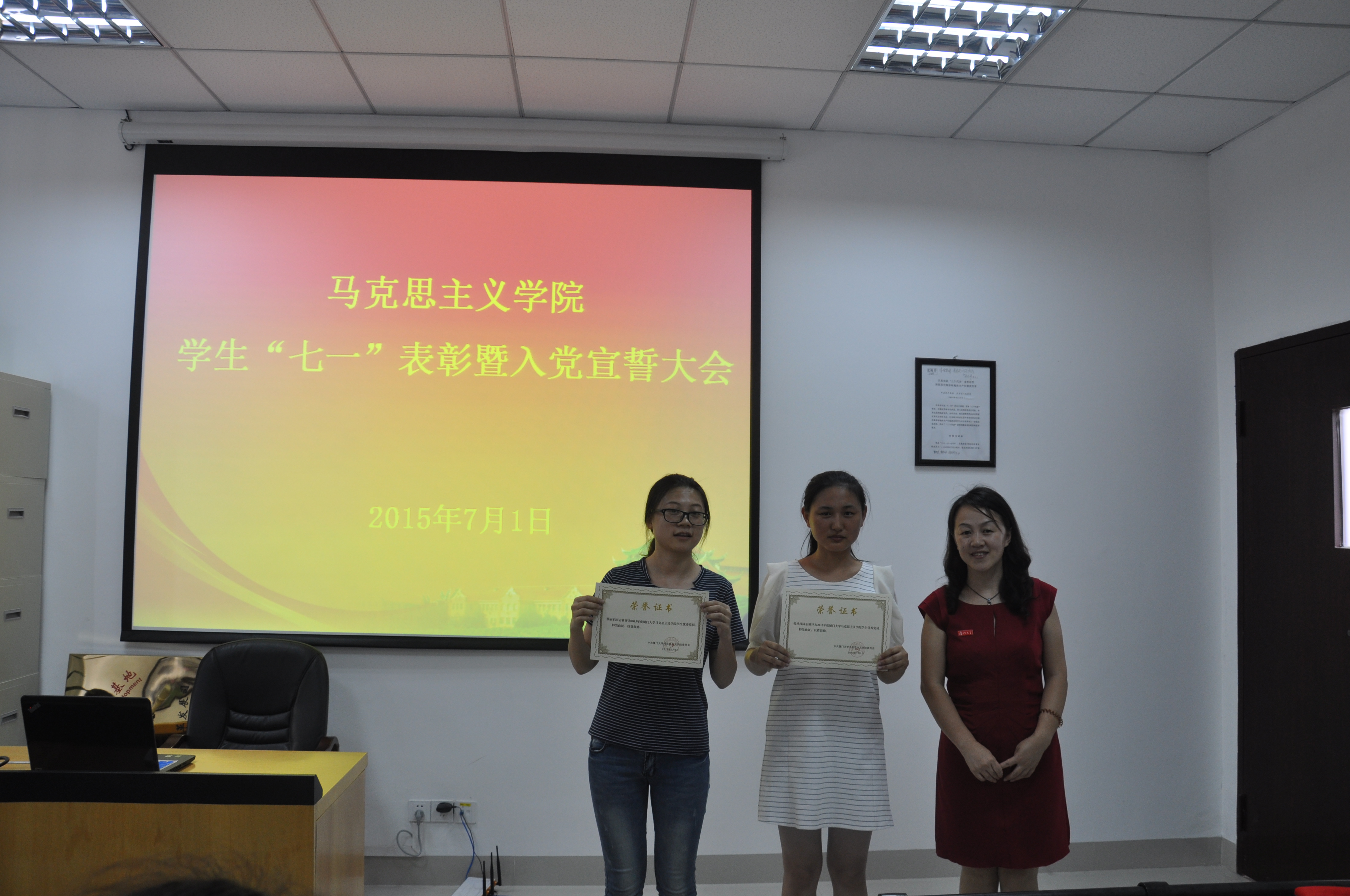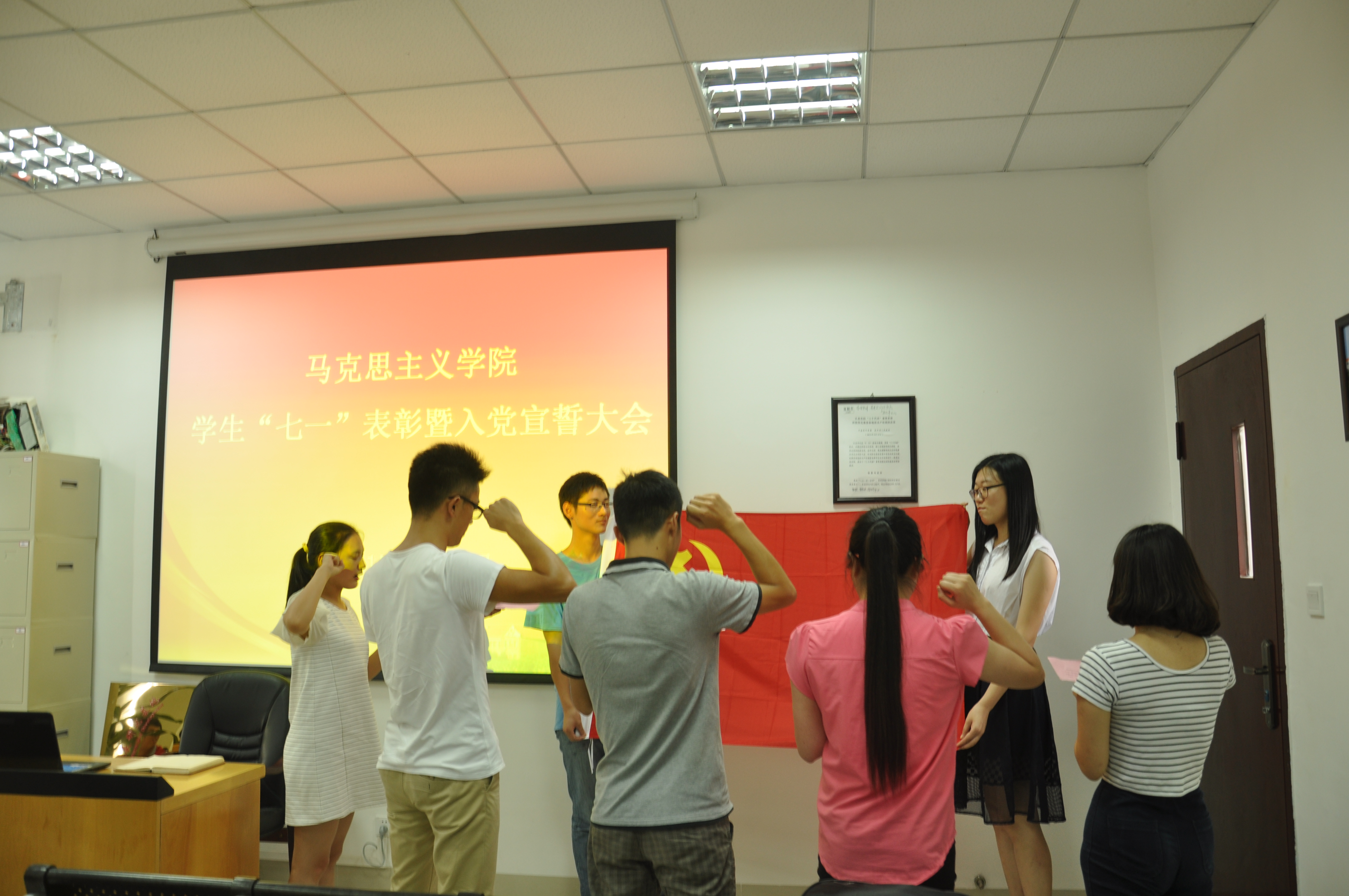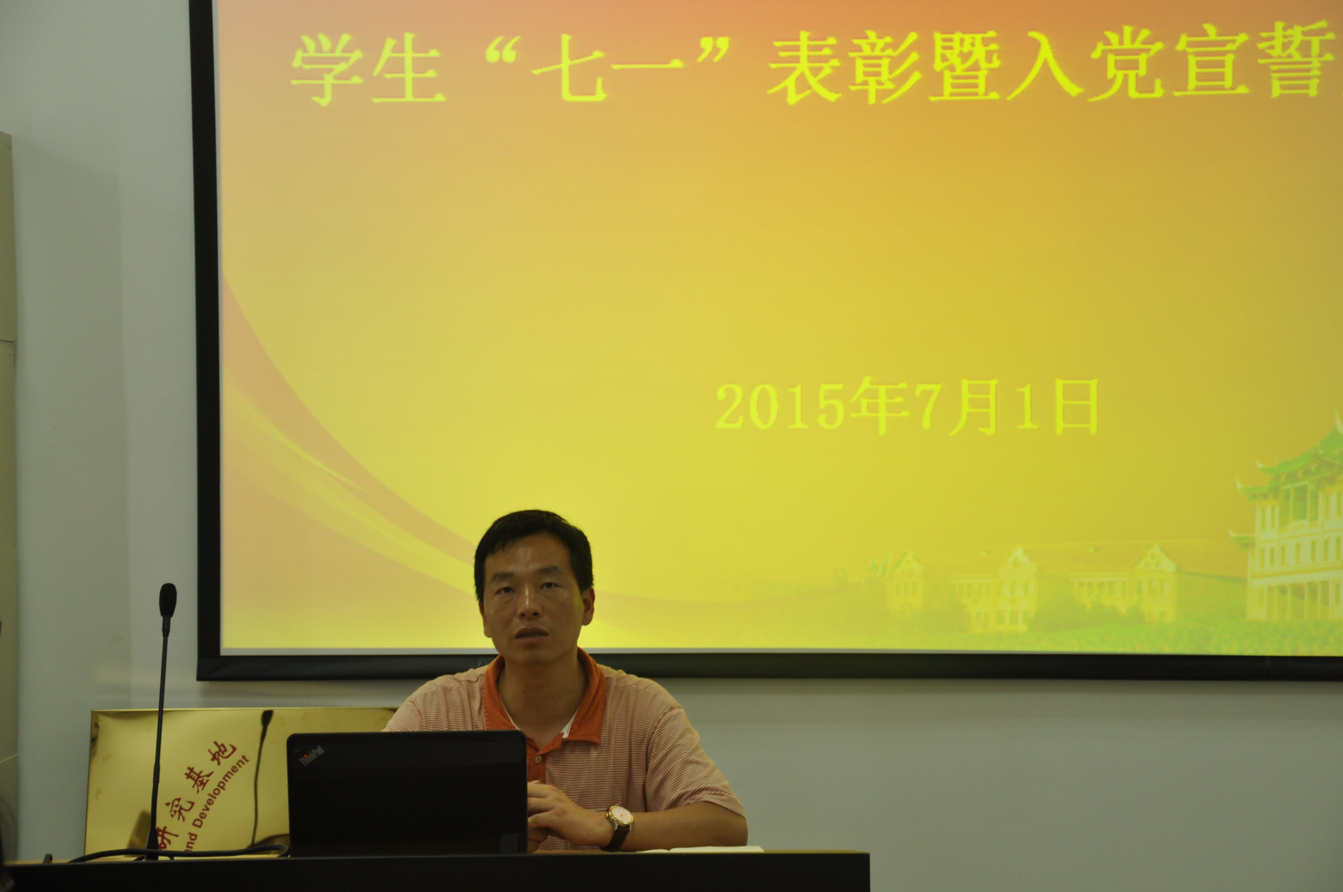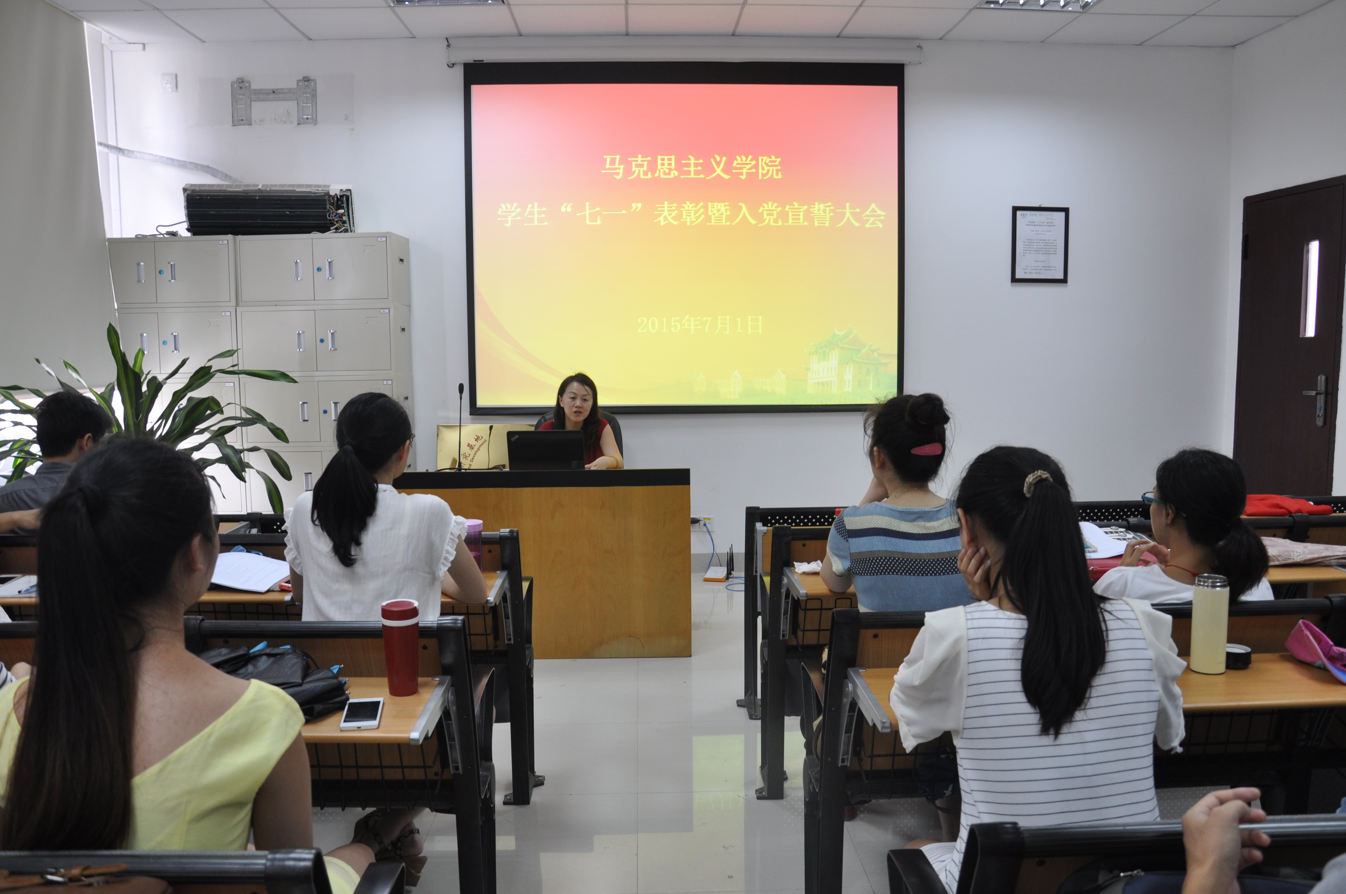 为喜迎建党94周年,2015年7月1日下午我院在海外楼414召开学生党员“七一”表彰暨入党宣誓大会。院党委原宗丽副书记和团委蔡虎堂书记以及全院学生参加了此次大会。会议由蔡老师主持。