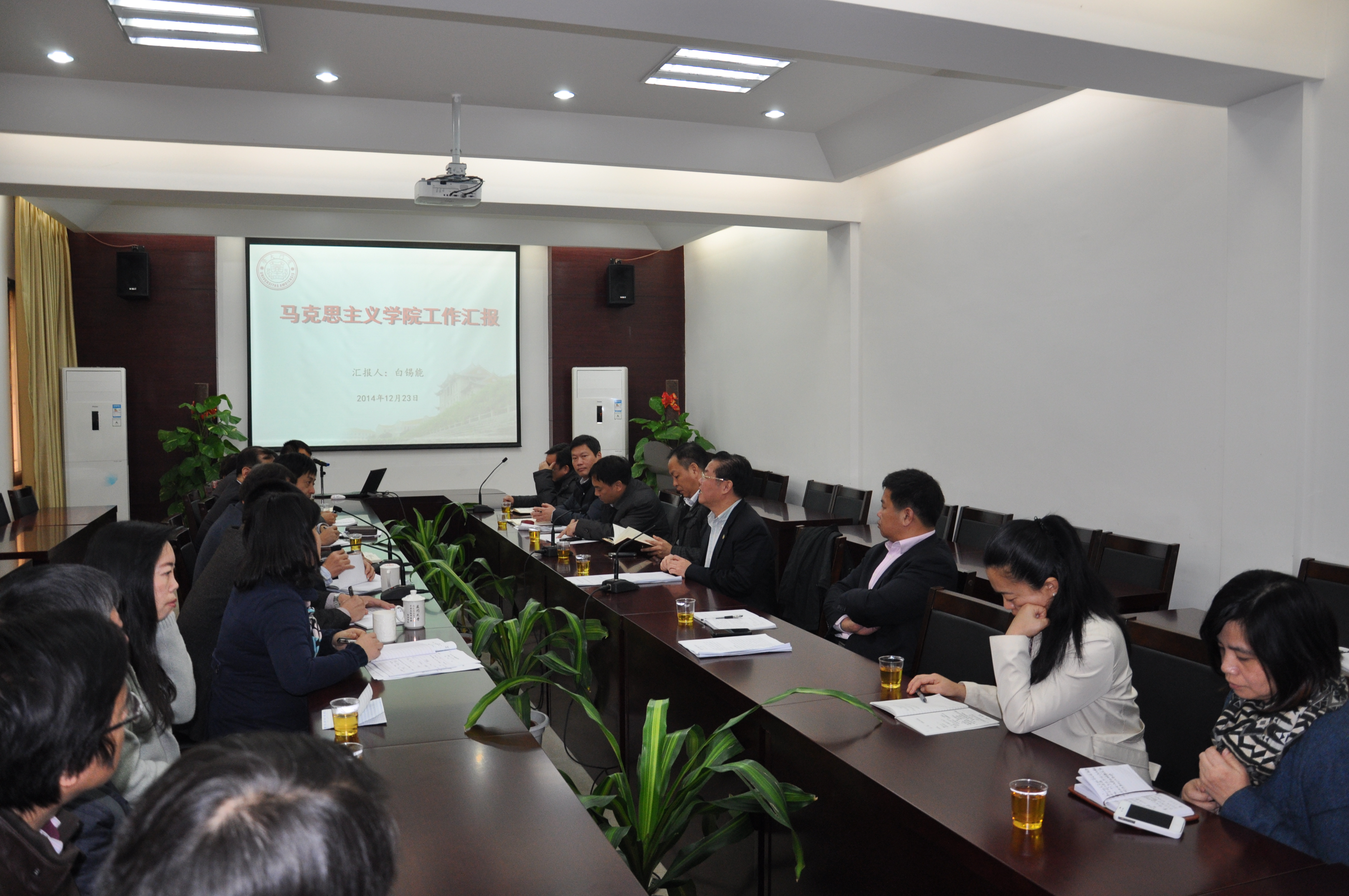会上,白锡能院长从人才培养、科研能力、学科建设、队伍建设、学术交流、社会服务等方面汇报了学院近年来取得的成绩、目前存在的问题与困难、以及解决的思路与举措,并对今后学院发展中面临的机遇和挑战进行了深入分析。白院长强调指出,希望学校能根据马克思主义学科发展的特殊性,在博士点建设、省级协同创新中心建设,科研和学科建设以及思政课教学改革上得到学校在经费、政策和管理机制等方面的大力支持。张有奎副院长、贺东航教授等也在学科及科研建设等方面作了补充汇报。