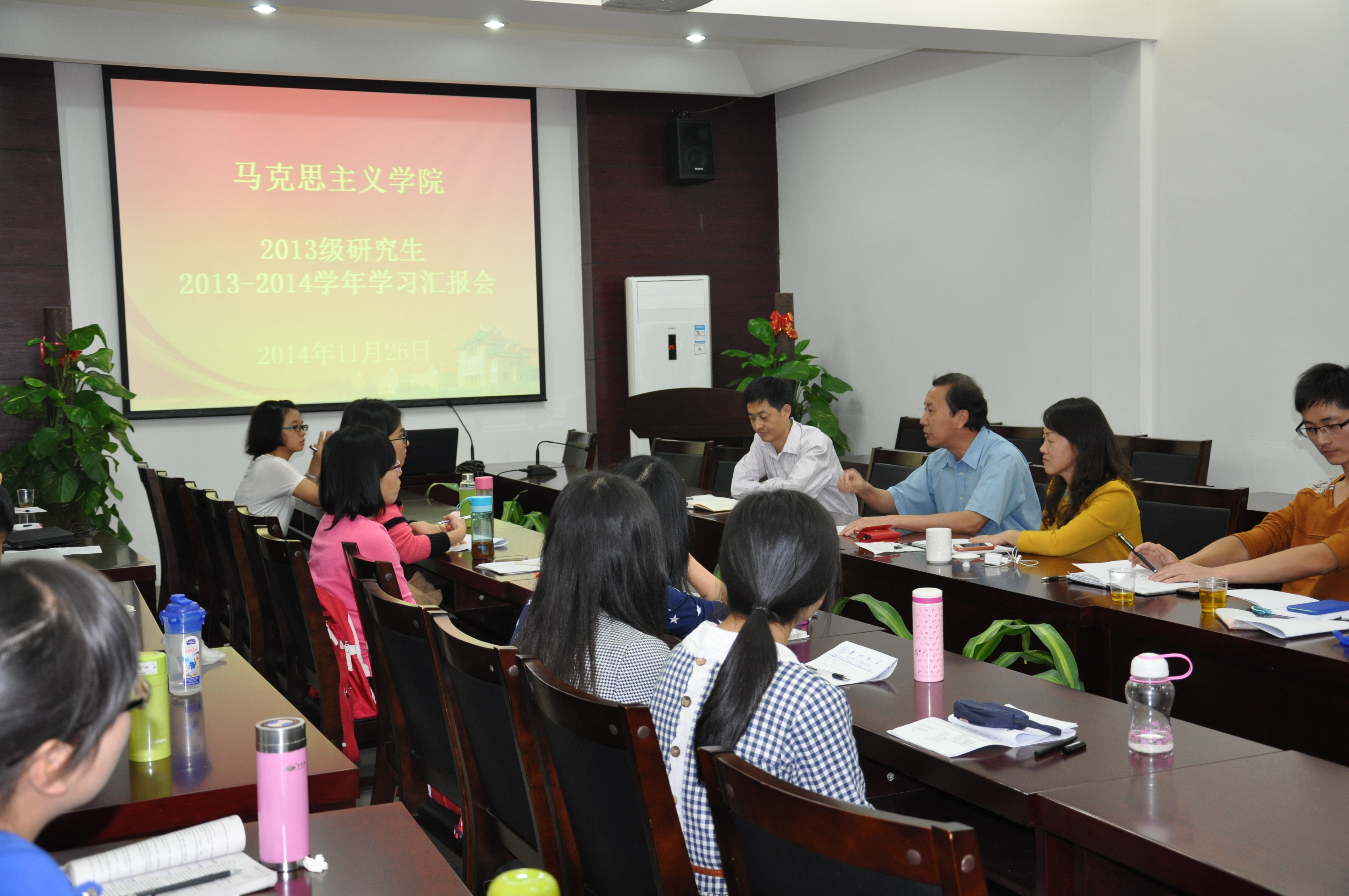 11月26日下午, 学院在110会议室举行了2013级硕士研究生2013-2014学年度学习汇报会。学院白锡能院长、张有奎副院长、原宗丽副书记,以及2013级和2014级全体硕士研究生参加了此次汇报会。汇报会由原宗丽副书记主持。
