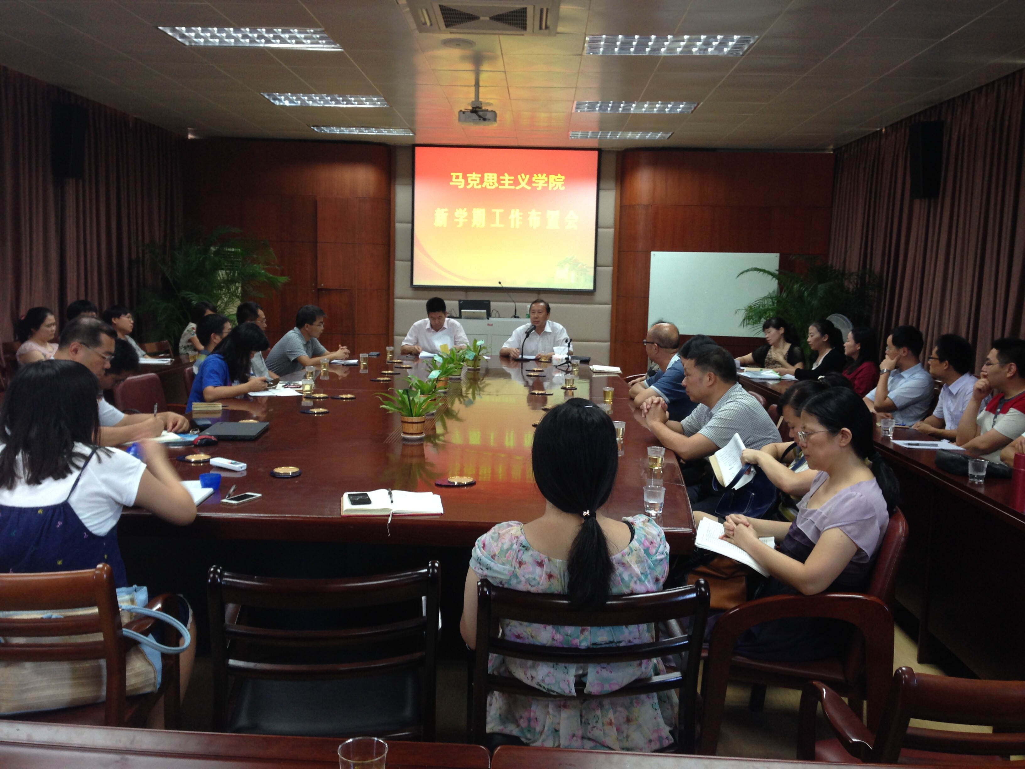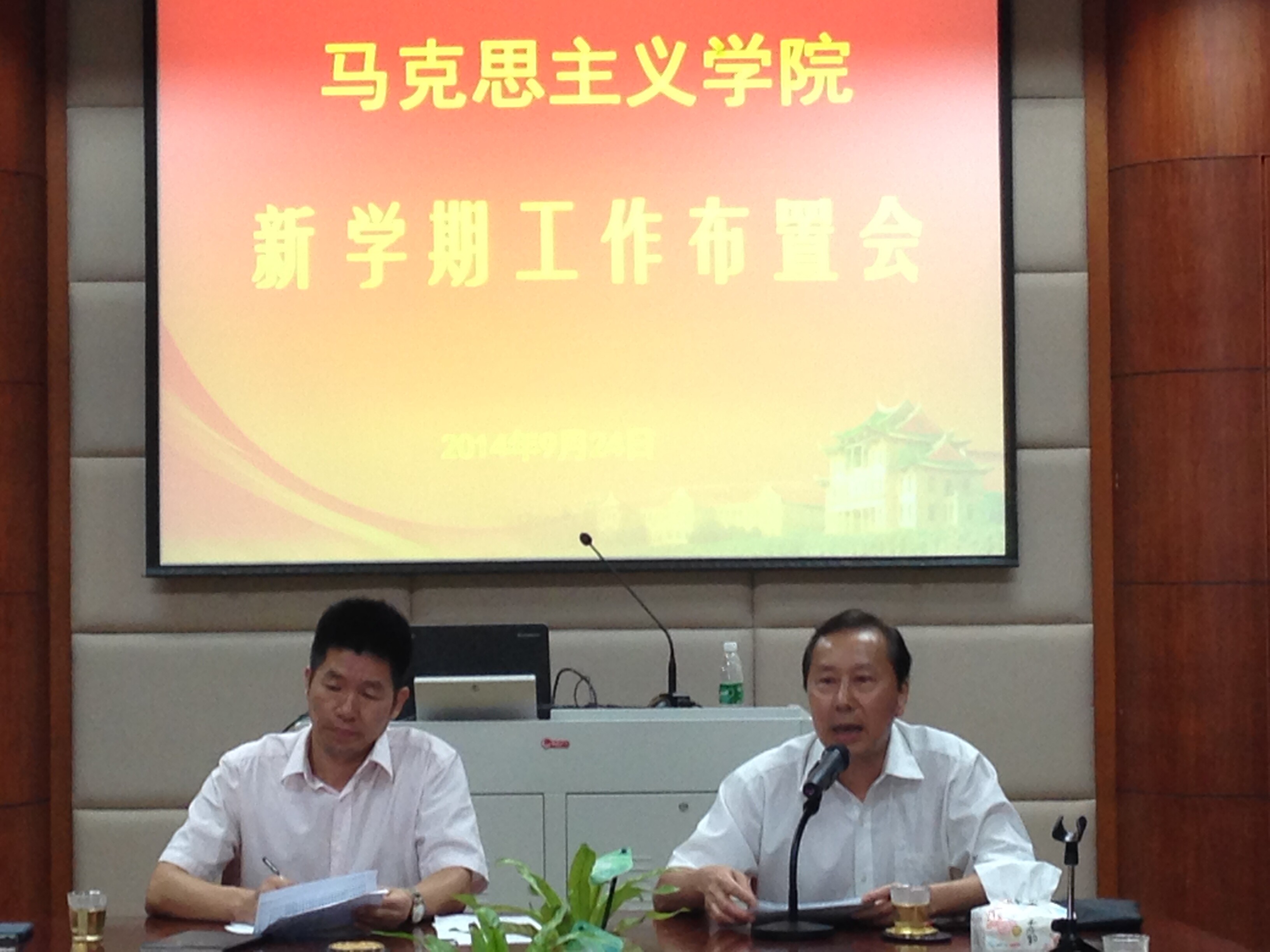 2014年9月24日下午,马克思主义学院在海外楼五楼会议室召开新学期工作布置会,学院白锡能院长、许和山书记、张有奎副院长、石红梅副院长、原宗丽副书记以及全体教职工参加了会议。会议由许和山书记主持。