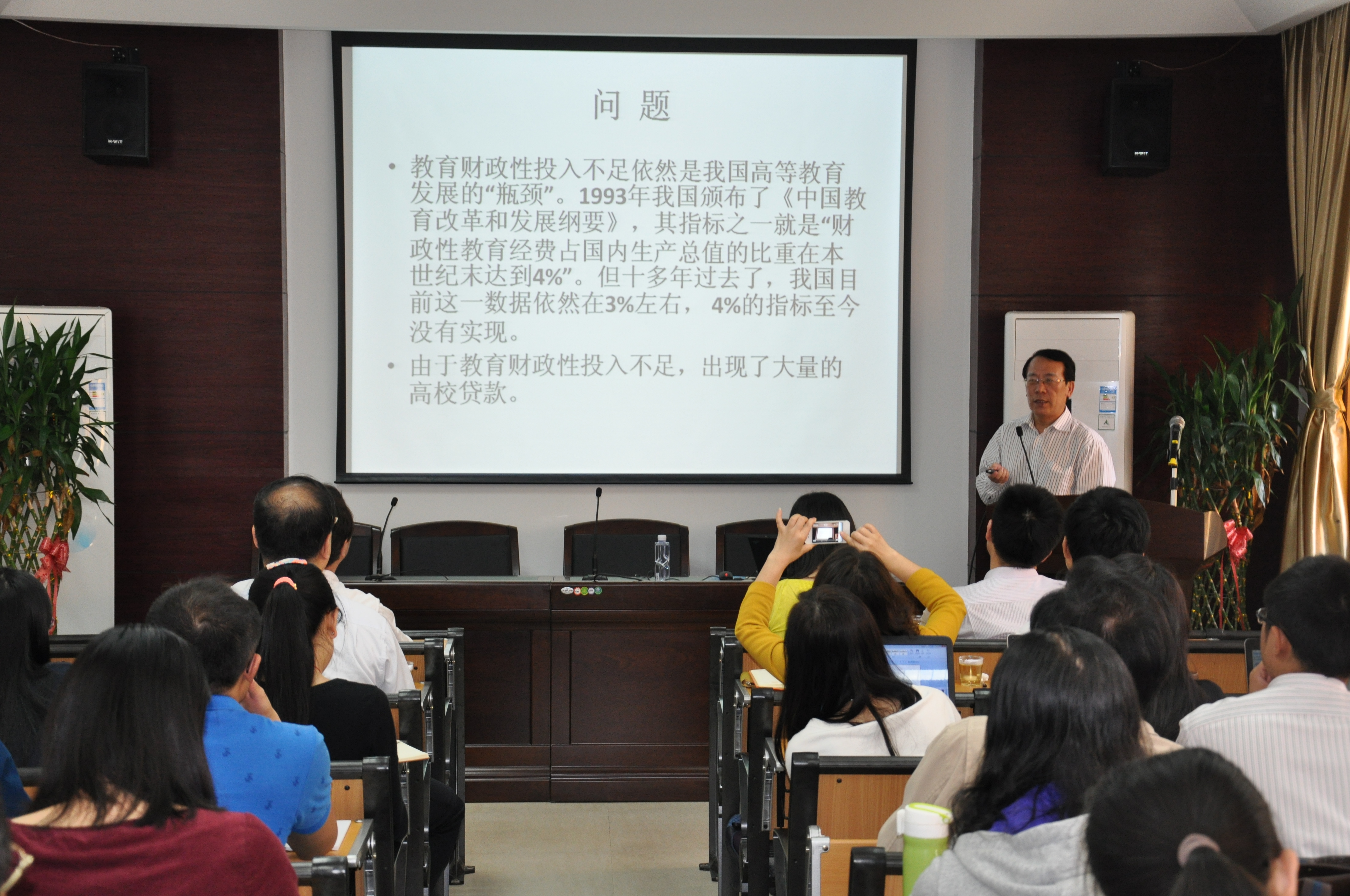 邬大光教授以自身的学术研究经历说起,讲述了自己在对高校贷款进行研究时数据搜集的过程以及通过一系列调查研究获得的成果,同时还对近期高校基金会的研究做了介绍。邬大光教授的报告中运用了大量的数据,并结合具体事例进行分析,整个报告深入浅出、内容翔实、形式生动,博得了听众的阵阵掌声。邬大光教授对高校贷款问题进行了十多年的研究,他指出,在这一研究过程中的成果和荣誉是不曾预料的。他认为,对于马克思主义学院来说,在今后的科研过程中,应当结合当前学院“中国发展道路”的研究课题,确立重大现实问题导向,重视实证研究。他对于学院教师提出希望,认为研究若能够抓住一个问题,专注钻研下去,坚持五到十年,必然会取得一定的成果。