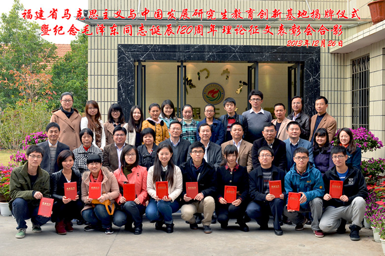 2013年12月26日上午,福建省马克思主义与中国发展研究生教育创新基地揭牌仪式暨纪念毛泽东同志诞辰120周年理论征文表彰会在我院隆重召开。厦门市委组织部有关领导,厦门大学党委组织部、宣传部、学生处、研究生院、校团委、马克思主义学院等部门负责人,教育创新基地导师、学生、征文比赛获奖者参加了此次活动。会议由学院副院长张有奎教授主持。