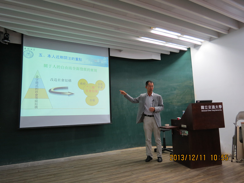 2013年12月11日上午,我院马克思主义基本原理概论教研室张艳涛副教授应邀在台湾交通大学为本科生讲授“中国大陆马克思主义研究整体图景”。讲授内容包括当代中国马克思主义哲学界概览、马哲研究与中国哲学研究的交集、马哲研究与西方哲学研究的交集、“中哲”“西哲”“马哲”研究的互动等四方面内容。讲授主要围绕马克思主义哲学研究的三条路径进行展开,试图站在实践和时代的新高度,从研究对象中概括出满足时代需要的新的理论认识和思想资源,以世界眼光发掘和展现马克思主义哲学与时俱进的当代意义。在以理工为特色的交通大学,大学生对马克思主义依然具有兴趣,对于中国大陆学者来台湾讲授马克思主义,同学们反响强烈;讲座也加深了他们对于中国大陆马克思主义发展状况的了解。