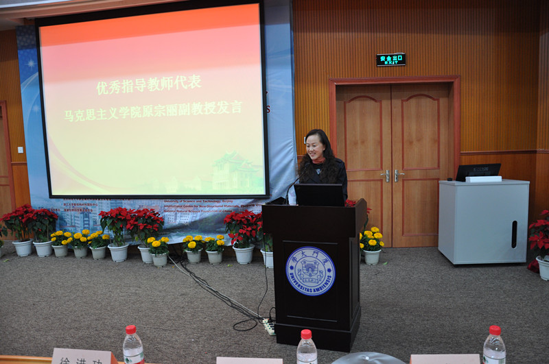 原宗丽副教授代表获奖指导教师分别从实践教学是深化思想政治理论课教学规律探索的着力点,是提升大学生对于思想政治理论课认同感的有效抓手,是锤炼当代大学生实践素养和科研能力的重要途径与形式三个方面,和大家一起分享了自己作为一线指导老师对实践教学的感想与体会。