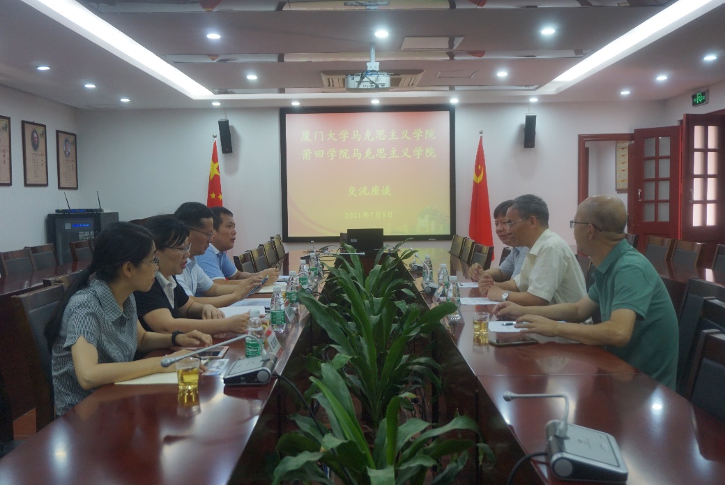在座谈会上,侯利标书记详细介绍了我院加强师资队伍建设的具体举措,坚持培引并重,通过引进、转岗、合聘等多种渠道,加大支持和培训力度,不断充实和提升师资队伍的规模和素质,同时也介绍了我院近年来学科建设的基本情况。罗文老师重点介绍了我院思政课实施专题教学、网络教学、社会实践教学“三位一体”教学改革的目的、具体实施方案和经验。邱志强老师介绍了“概论”课具体如何开展专题教学和社会实践教学的情况。莆田学院马院俞国锋研究员、陈培涵副教授先后介绍了莆田学院马院在师资队伍建设、学科建设和思政课教学改革等方面的情况。此后,双方进行了热烈的探讨。