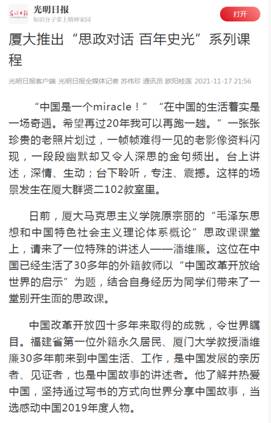 11月17日,光明日报客户端以“厦大推出‘思政对话 百年史光’系列课程”为题,报道了我院把党史学习教育融入思政课的做法。