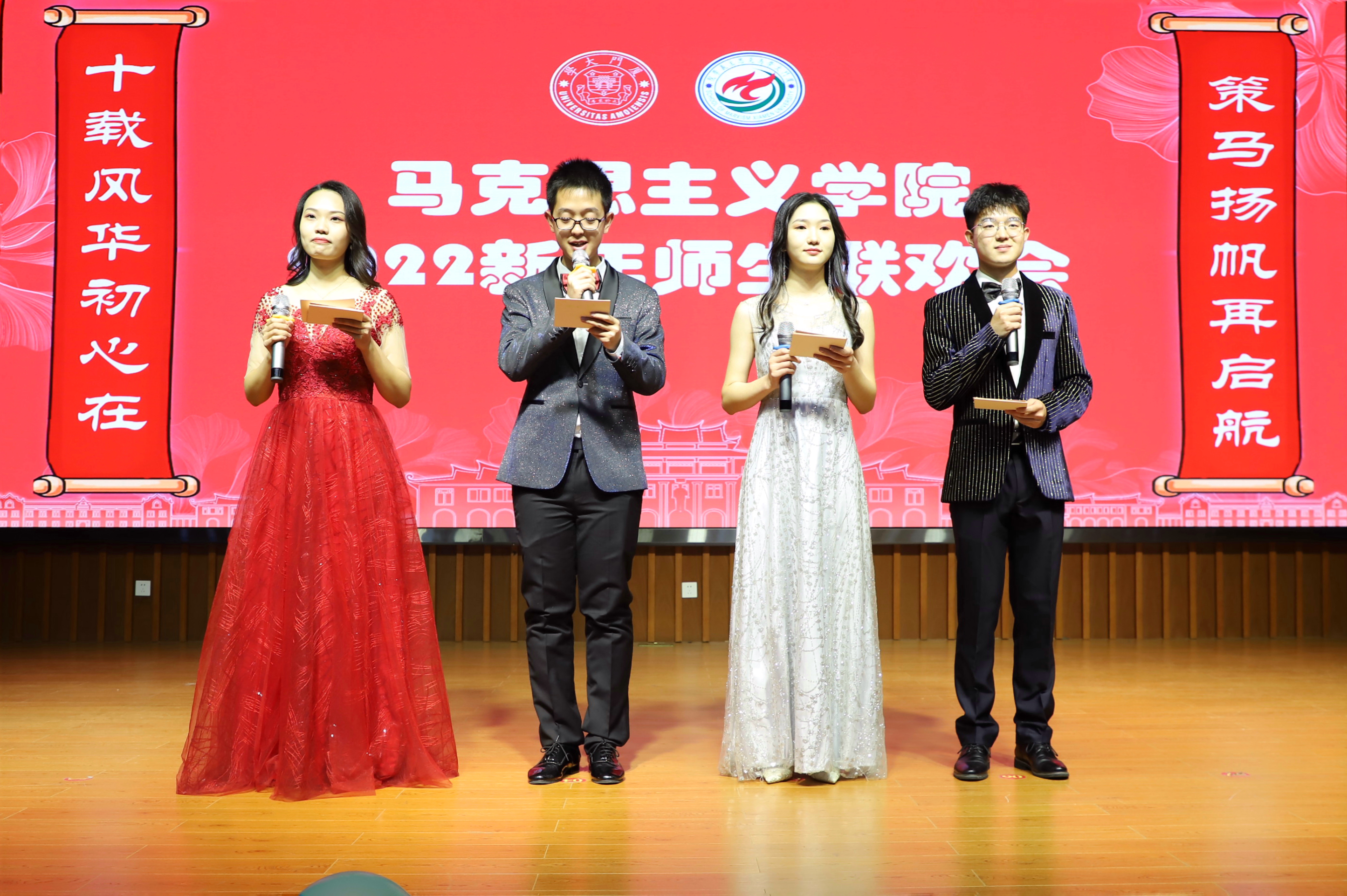 以心迎新,致敬百年。2022年1月7日晚,我院在法学院模拟法庭举办“十载风华初心在,策马扬帆再启航”新年师生联欢会。原厦门大学党委常委、马克思主义学院院长白锡能,法学院党委书记、原马克思主义学院党委书记许和山,马克思主义学院党委书记石红梅,党委副书记、常务副院长张有奎,党委副书记杨建中,副院长原宗丽,副院长张艳涛,院工会主席杨晨,教师代表和学院学生到场参加。晚会由王雅琪、聂嘉琪、张怡和罗仁杰主持。