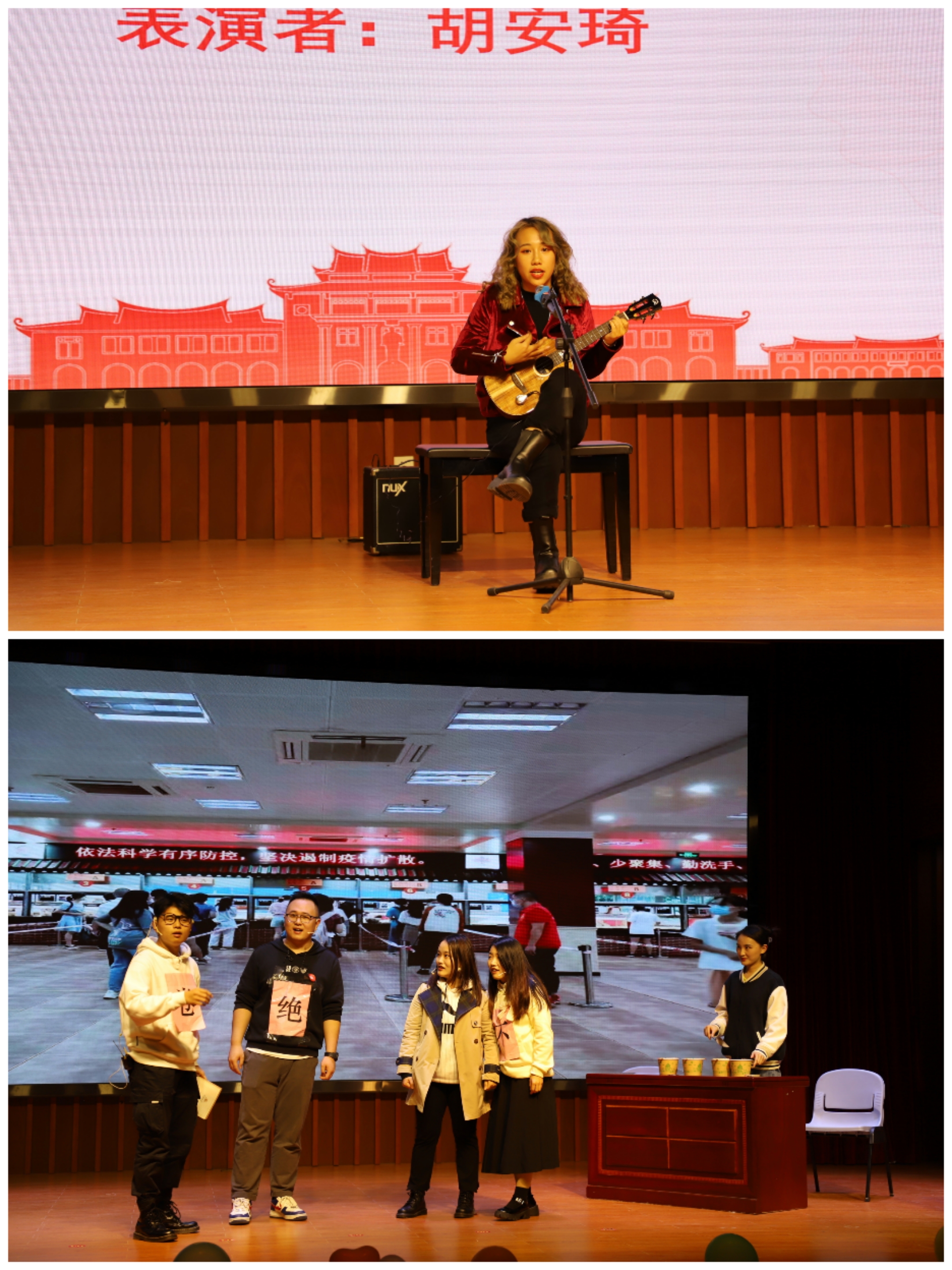 胡安琦同学以一曲尤克里里弹唱《欧若拉》,在歌声中传达出对师生的美好祝愿。苏悦、乔璐璐、冯雨奇、刘张健、王志浩等同学带来的小品《内卷不绝》为我们展示了马院学子苦中有乐、劳逸结合的学习日常,引得大家捧腹大笑,更触发了同学们的强烈共鸣。