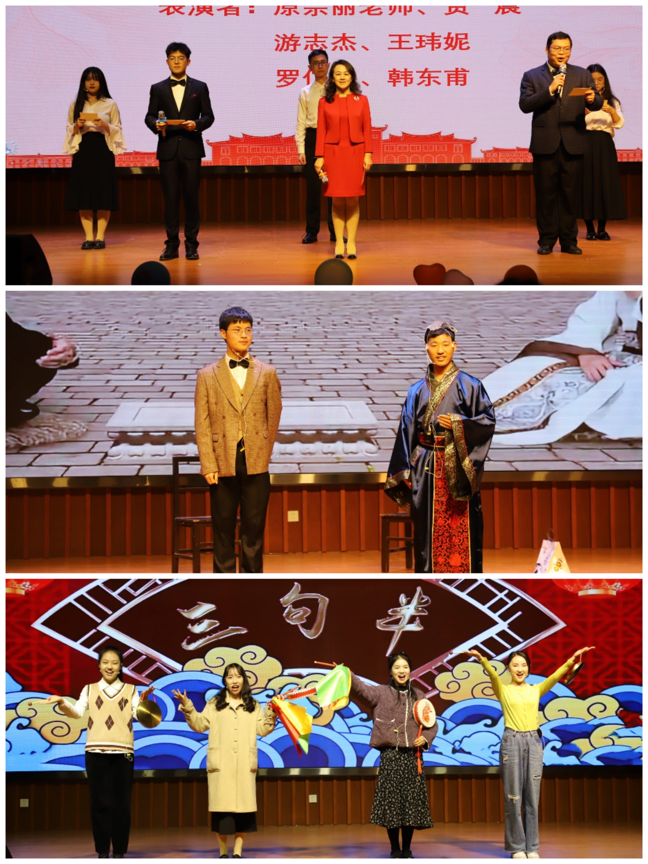 理论源于实践,艺术源于生活。王一帆、李琼、刘佳欣、邱佳欣同学合作演绎《喜贺元旦》三句半,她们的欢声笑语营造了喜庆的新年氛围。唐帅、吴波两位同学带来的情景剧《跨越时空的对话》脑洞大开,让马克思和孔子的伟大思想在舞台上碰撞出精彩火花。原宗丽老师和同学们深情朗诵诗歌《百年风华 强国有我》,体现了当代师生对伟大复兴梦想的担当。