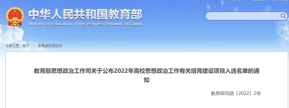 据悉,教育部“高校思想政治工作精品项目”旨在着力推进高校思想政治工作质量提升工程有效实施,充分发挥课程、科研、实践、文化、网络、心理、管理、服务、资助、组织等方面工作的育人功能,加快构建高校思想政治工作体系,探索形成具有可示范、可引领、可辐射、可推广、可持续意义的先进经验和典型做法,推动形成加强和改进高校思想政治工作“一校一品”或“一校数品”的生动局面。