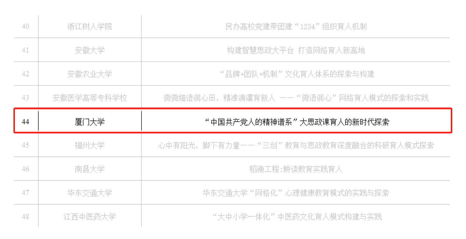 2月24日,教育部思想政治工作司正式公布2022年高校思想政治工作有关培育建设项目名单。厦门大学党委副书记、马克思主义学院院长徐进功教授牵头申报的《“中国共产党人的精神谱系”大思政课育人的新时代探索》入选教育部2022年“高校思想政治工作精品项目”,这也是我校首次获批这类项目。