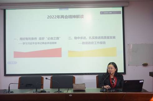 马克思主义学院袁华副教授作题为“2022年两会精神解读”的讲座,对如何学习贯彻2022年两会精神进行指导。她全面系统地解读了习近平总书记在两会中的重要讲话精神,并就如何走好“五个必由之路”进行了具体阐述。