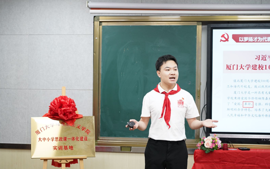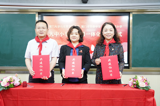 签约仪式上,厦门大学马克思主义学院党委书记石红梅、华侨中学校长金月明、演武小学校长王志勤代表三个单位正式签订协议书,拉开三校携手共建“大中小学思政课一体化”序幕,演武小学、华侨中学等两个“厦门大学马克思主义学院大中小学思政课一体化建设实训基地”也正式揭牌。成为实践基地后,演武小学和华侨中学就是厦大学子的“实践课堂”。