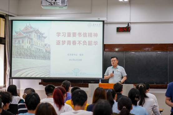 张荣以亲身经历过的3封书信:习近平总书记致第二十二届国际历史科学大会的贺信、给厦门大学外籍教授潘维廉的回信、致厦门大学建校100周年的贺信为切入点,结合当前国际国内形势、党和国家的大政方针,详细讲述了书信背后的故事,启示同学们要在新环境和新形势下,重视历史、研究历史、借鉴历史,坚定历史自信、把握历史主动;要坚定文化自信,站稳中华文化立场,学会以讲好个人“小故事”来展示国家的“大形象”;要努力成长为德智体美劳全面发展,具有引领性、人文性、时代性、开放性特征的新时代领军人才。