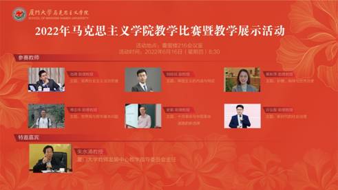 为提升学院教师教学技能与专业素养,推动我院教育教学工作的高质量发展,6月16日上午,马克思主义学院在囊萤楼216举办2022年教学比赛暨教学展示活动。活动特别邀请厦门大学教师发展中心教学指导委员会主任朱水涌教授进行指导点评。思政课教改研究中心负责人、各教研部主任参加活动。马克思主义学院副院长原宗丽主持活动。