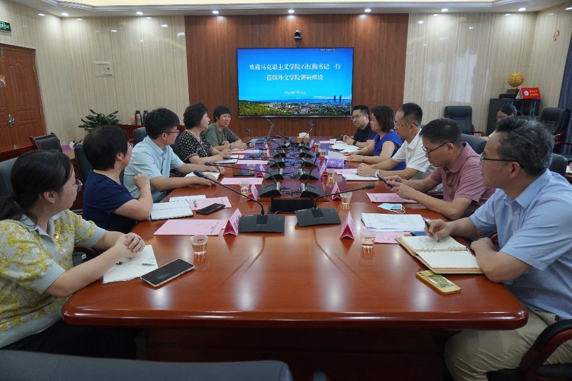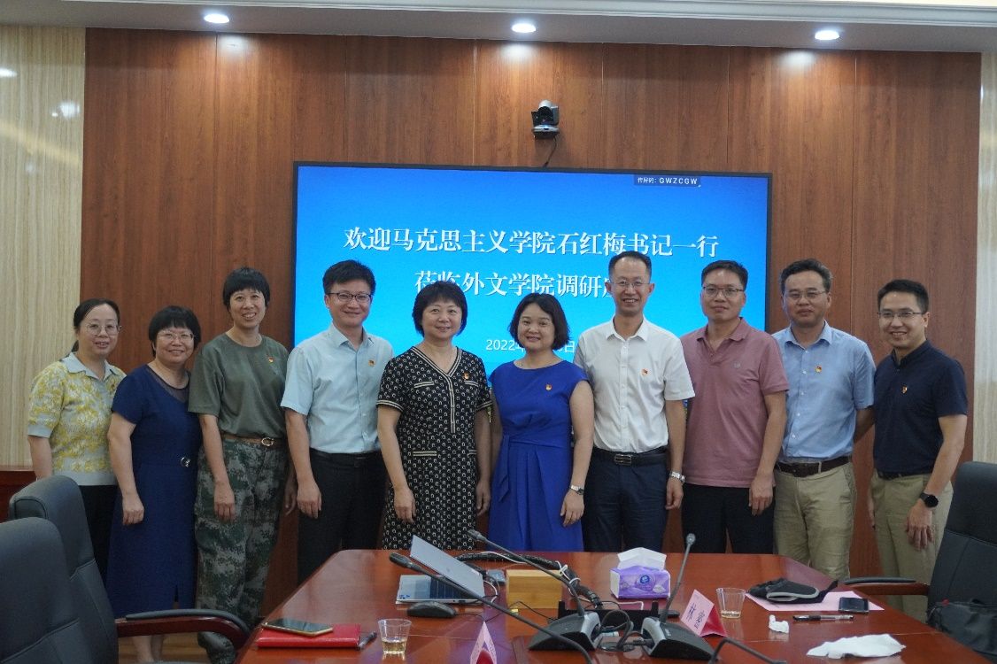在交流座谈会上,徐琪书记对马克思主义学院一行的到访表示热烈欢迎,同时,向大家介绍了外文学院的整体发展状况,特别是党建与业务融合方面的工作经验。石红梅书记对外文学院的热情接待表示衷心感谢,并就马克思主义学院的基本情况以及此行目的做了简要的说明。座谈会上,徐琪书记、江桂英副院长就外文学院在党建、教学、科研、学科建设等方面的情况进行了详细的介绍。其他与会人员围绕院部机构管理机制、教学与科研队伍组织优化、学科建设与公共课教学管理平衡等方面进行经验分享和深入探讨。